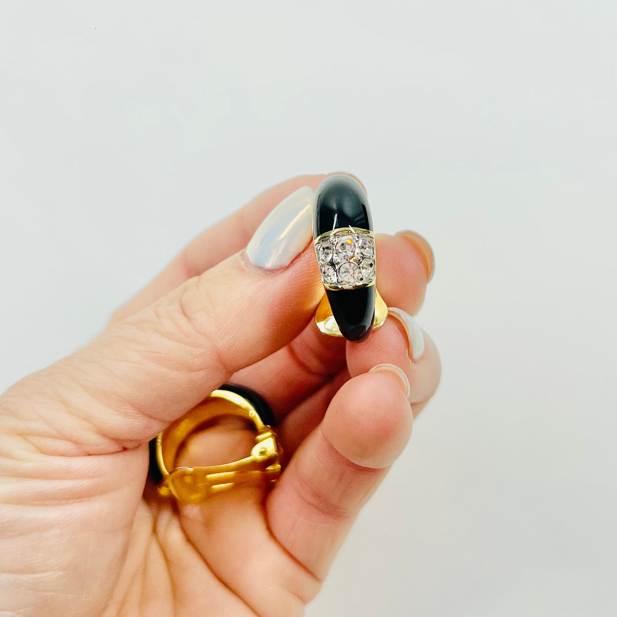 1980s BLACK ENAMEL DIAMANTE HOOPS CLIP ON EARRINGS