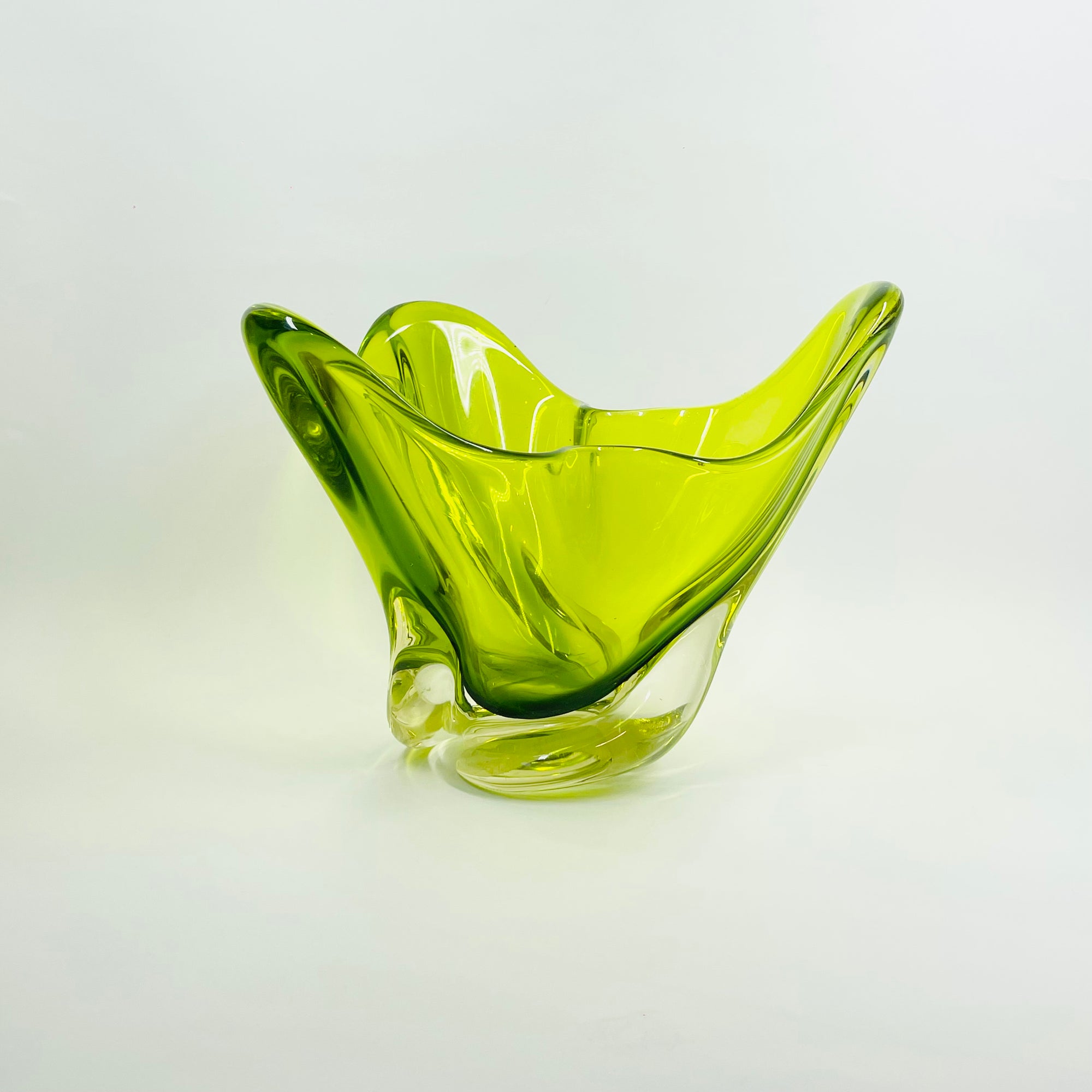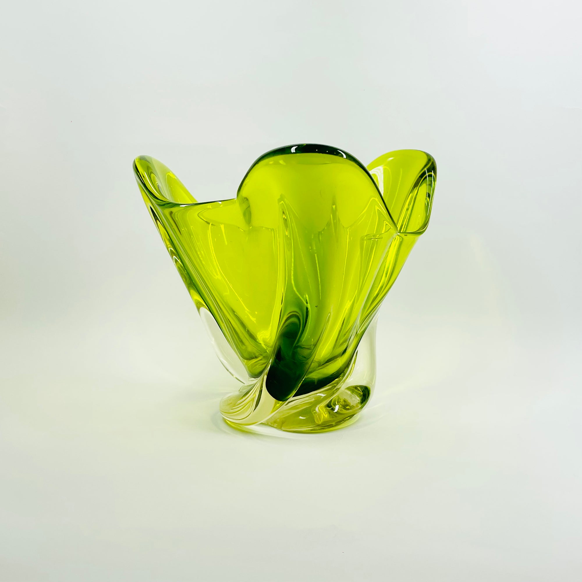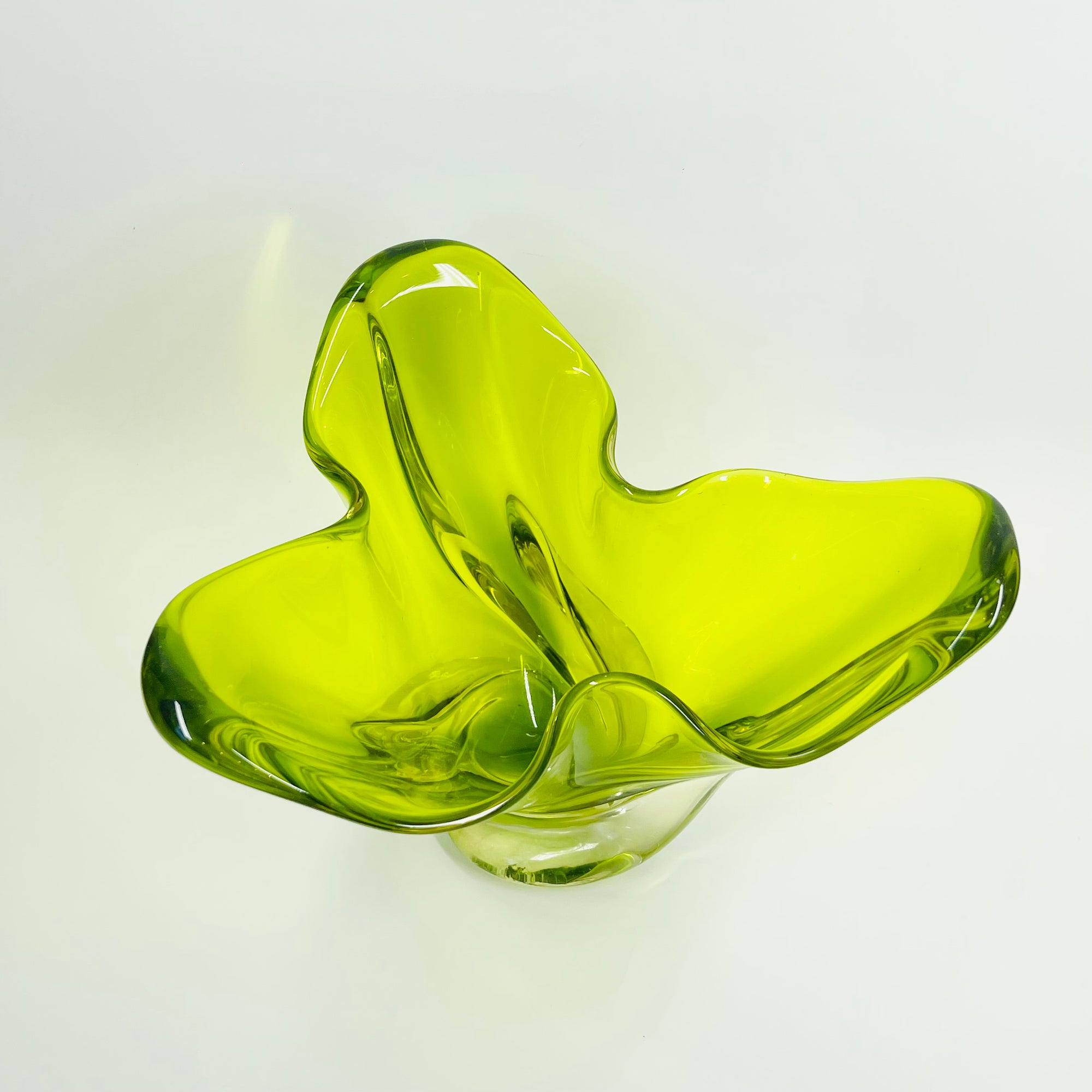 1970s JAPANESE GREEN SOMMERSO GLASS HANDKERCHIEF VASE/BOWL