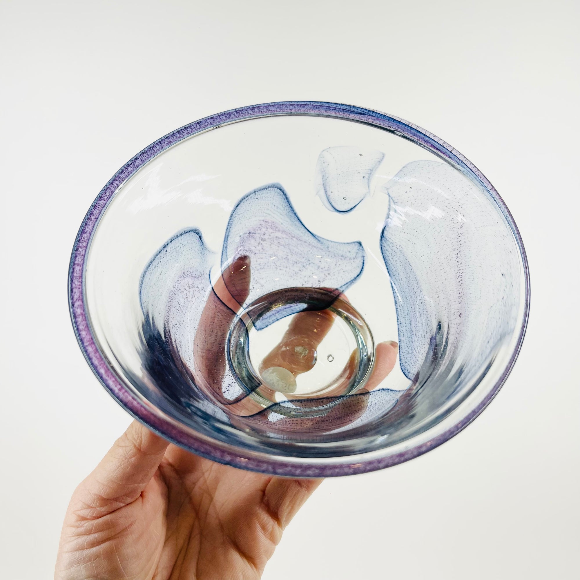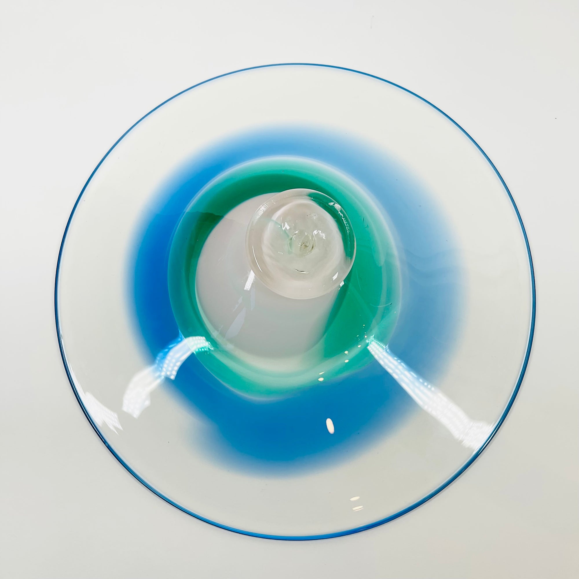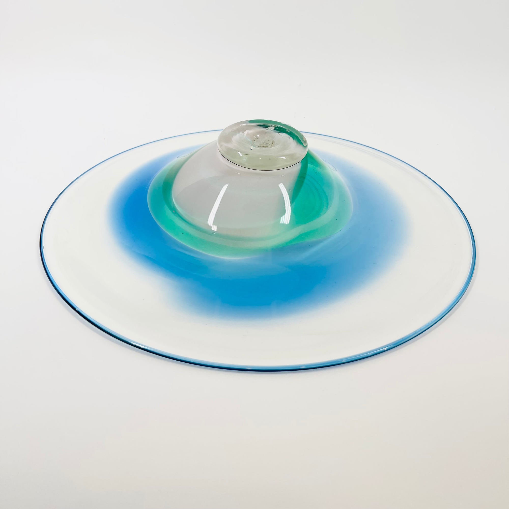 1980s MOUTH BLOWN BLUE GREEN ART GLASS BOWL BY SETSUKO OGISHI