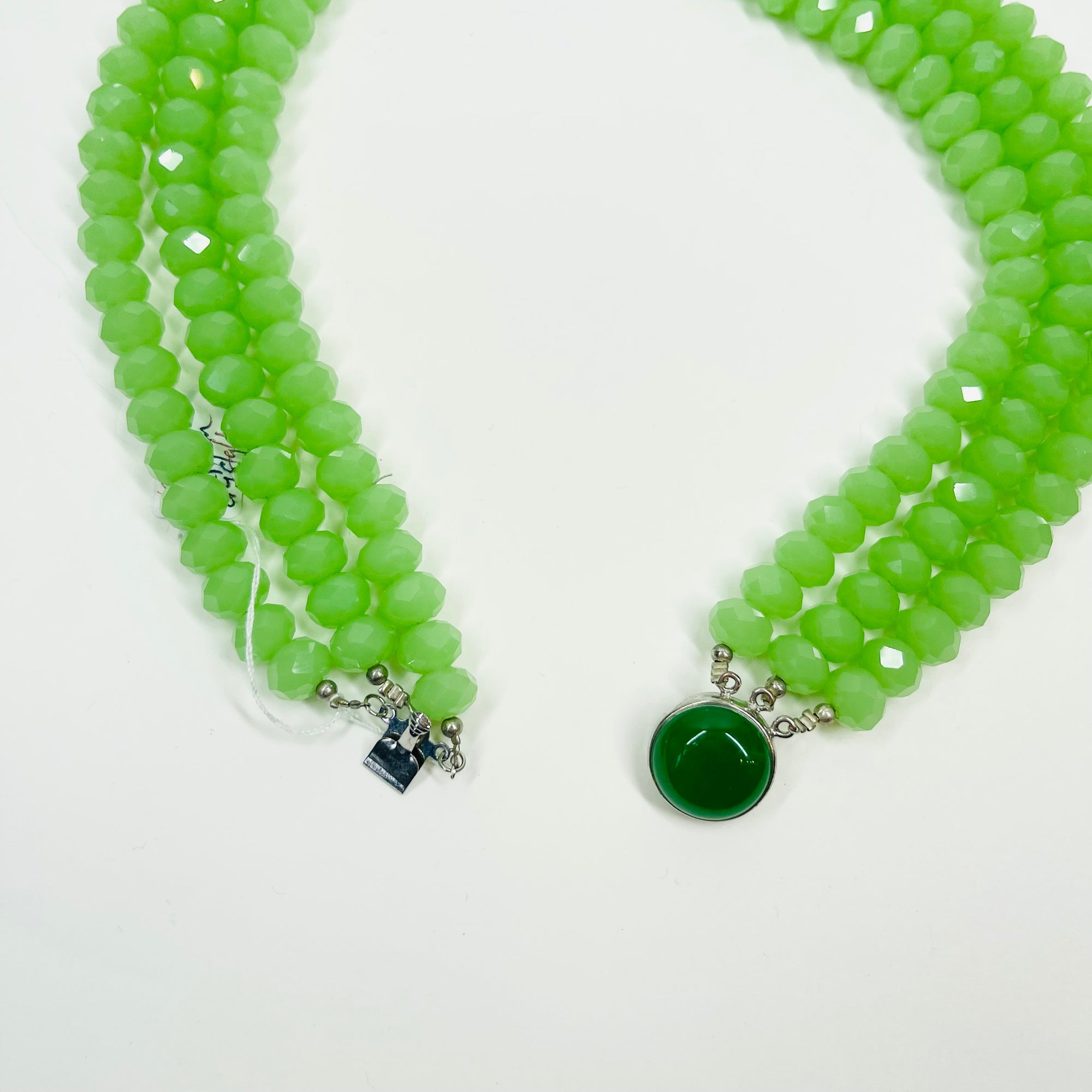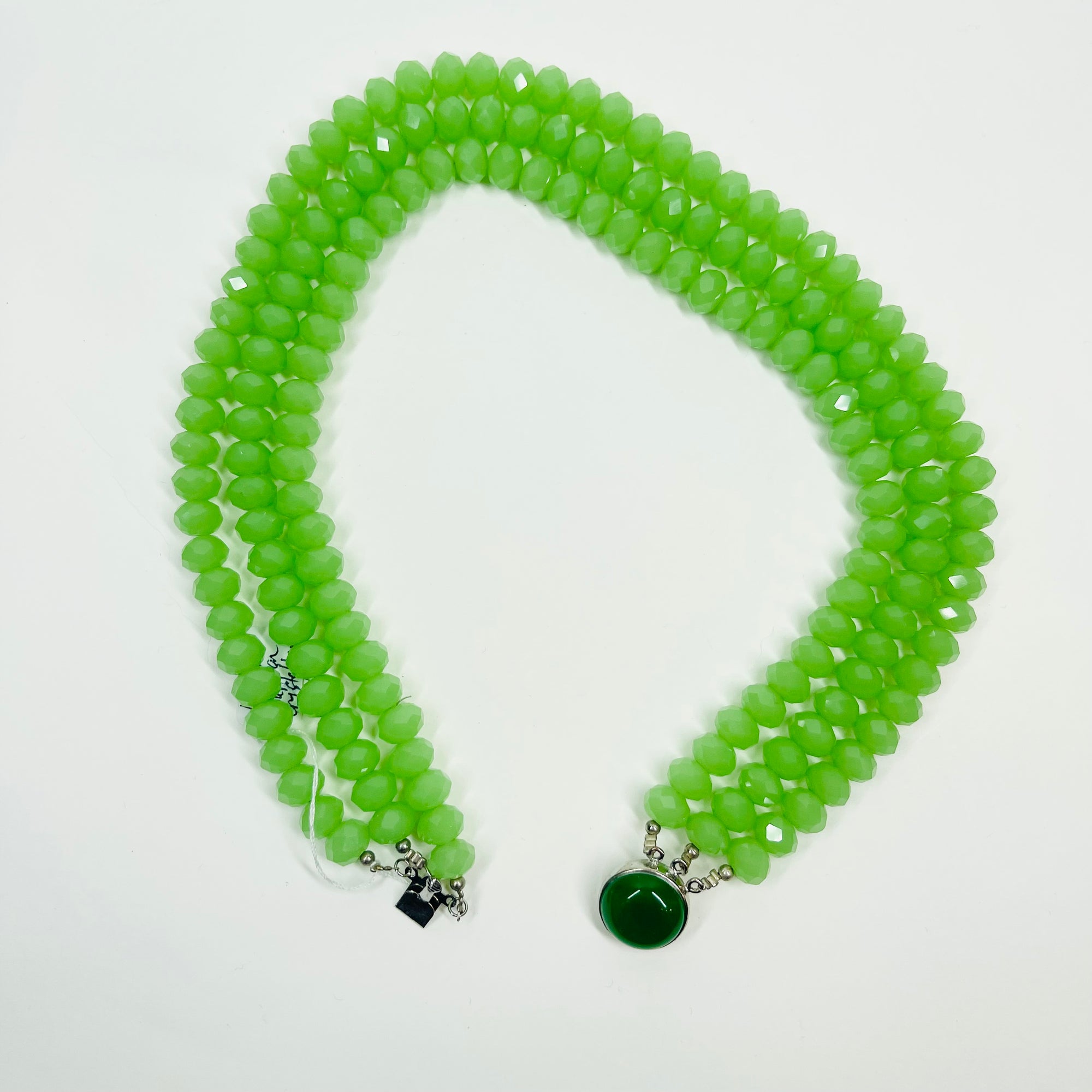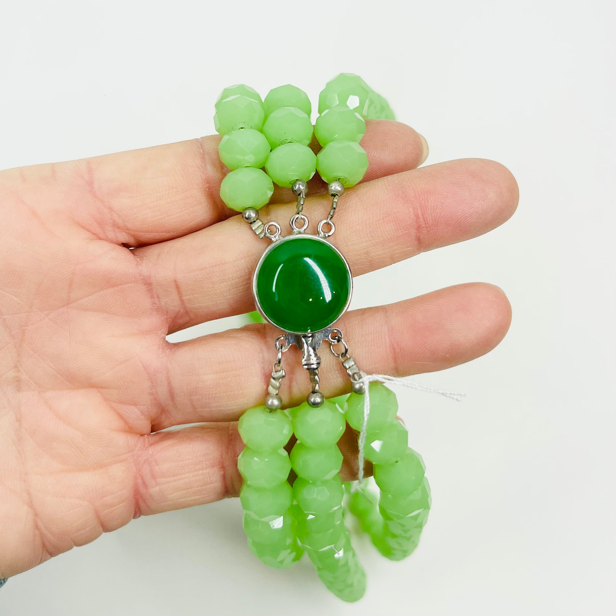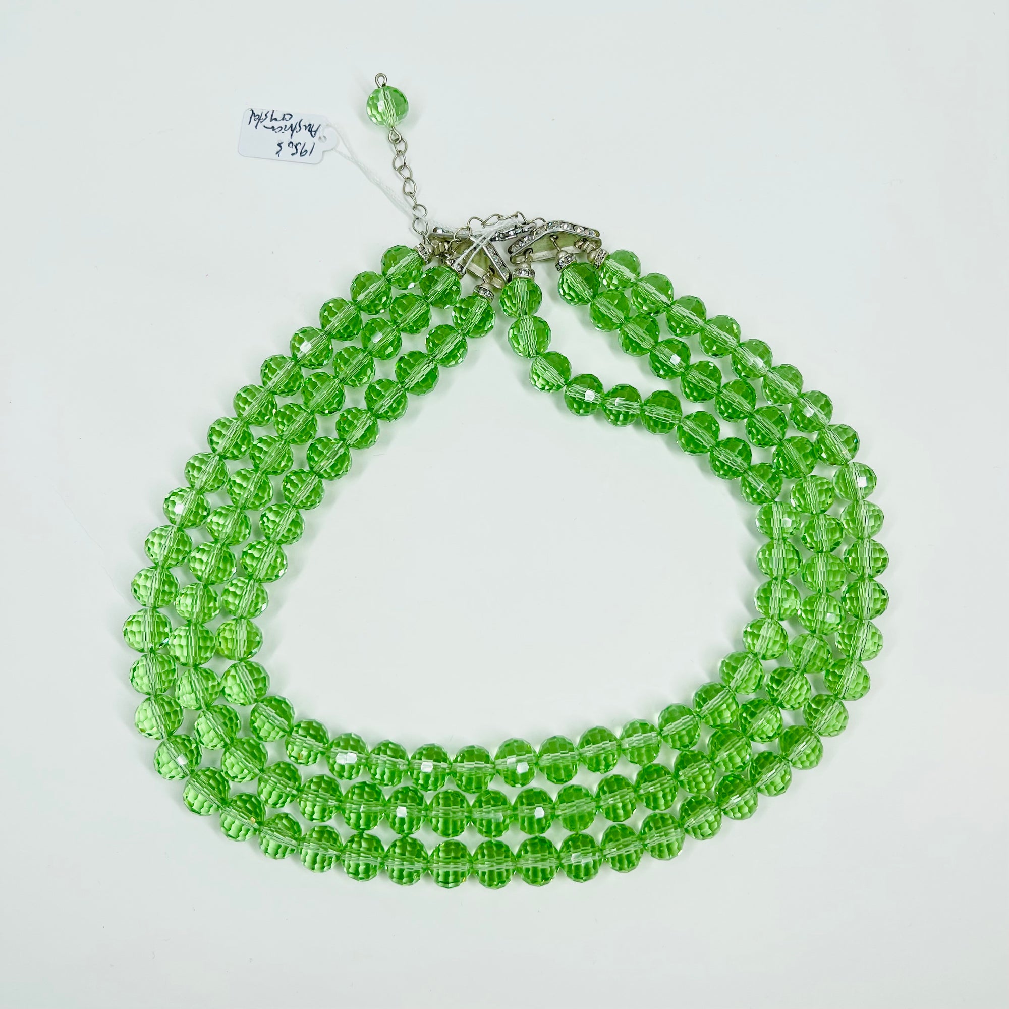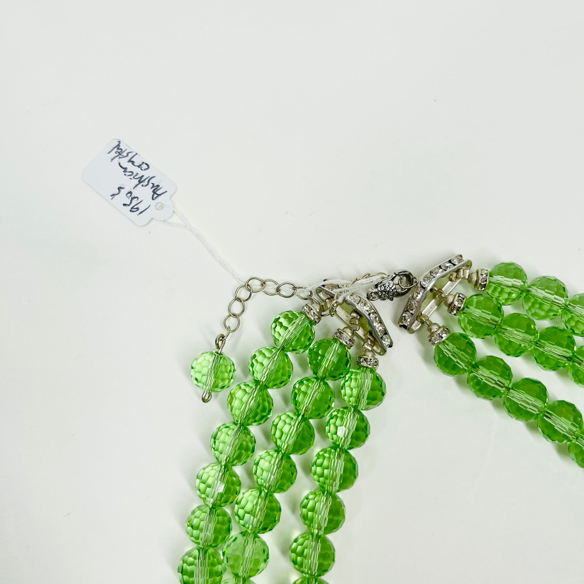 VINTAGE GREEN AUSTRIAN CRYSTAL BEADS NECKLACE WITH GREEN STONE PENDANT CLASP