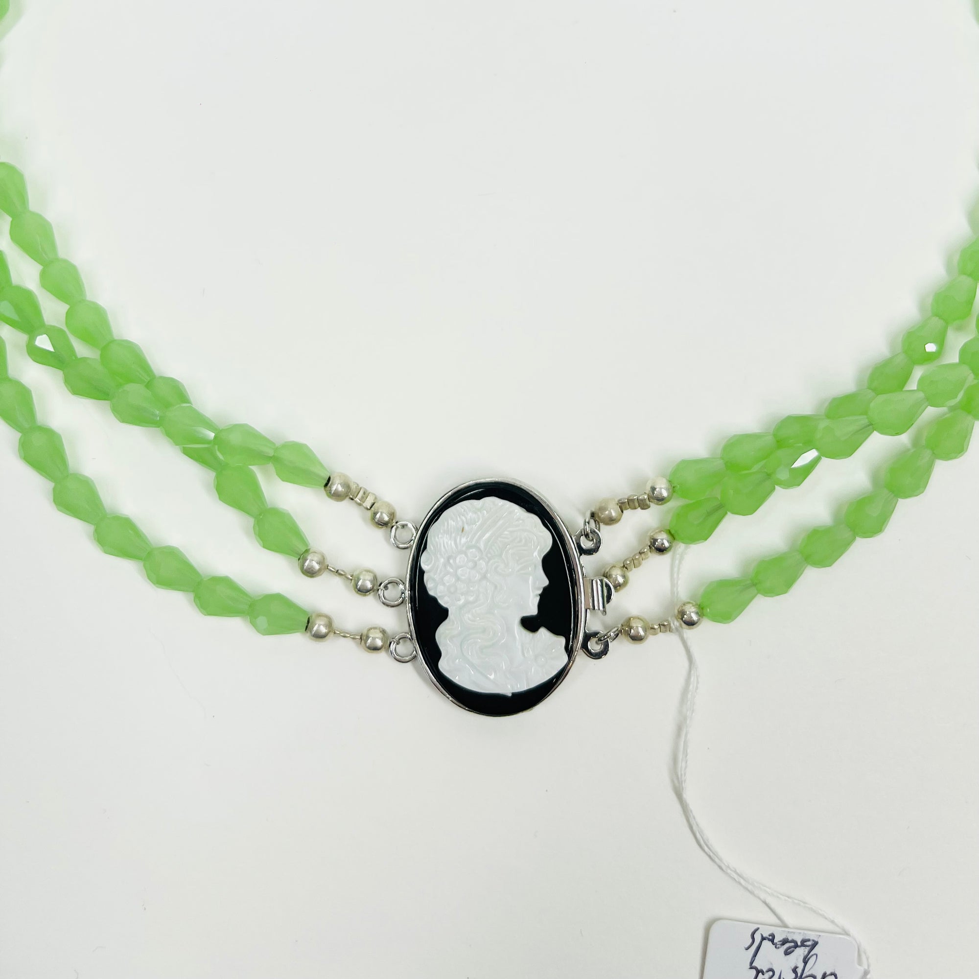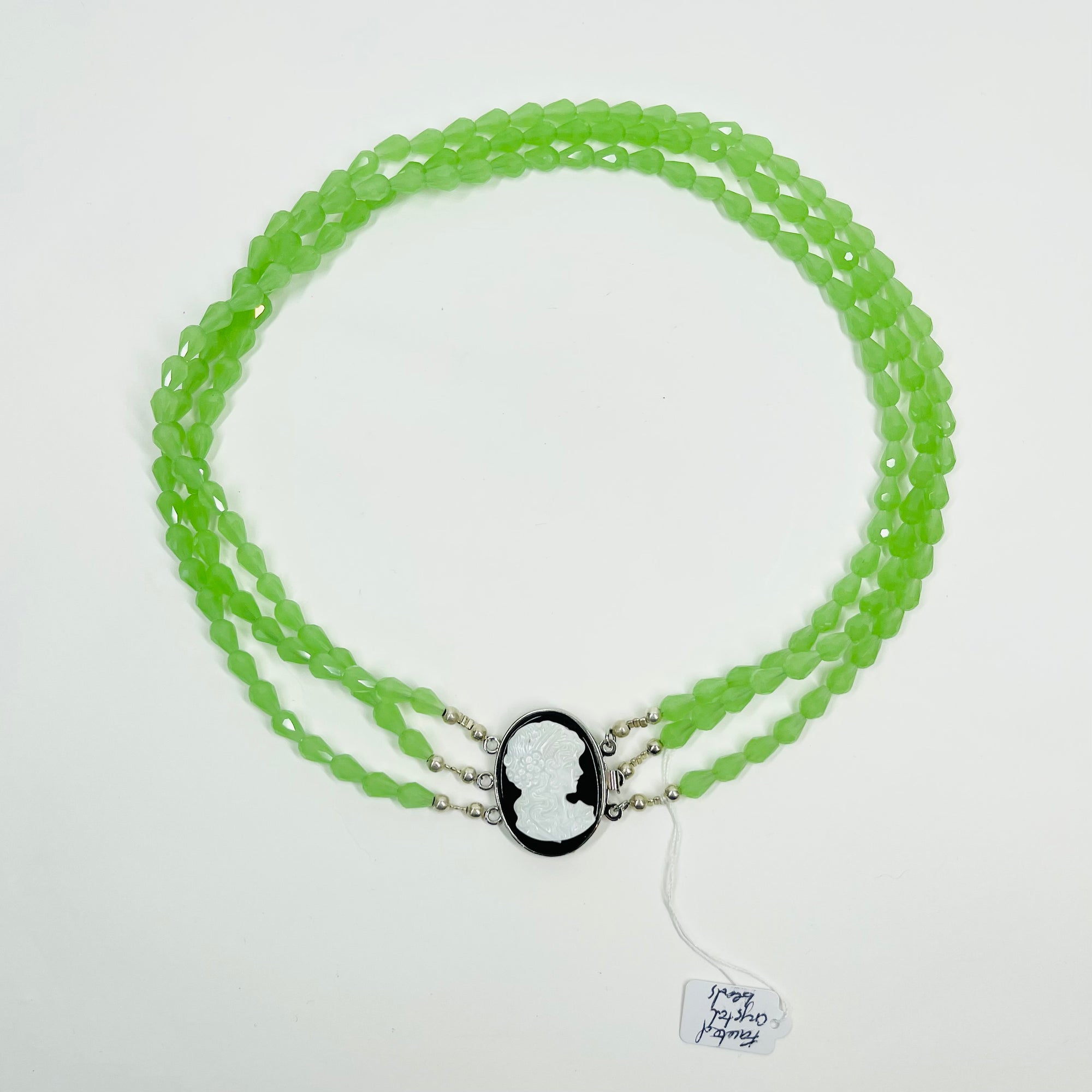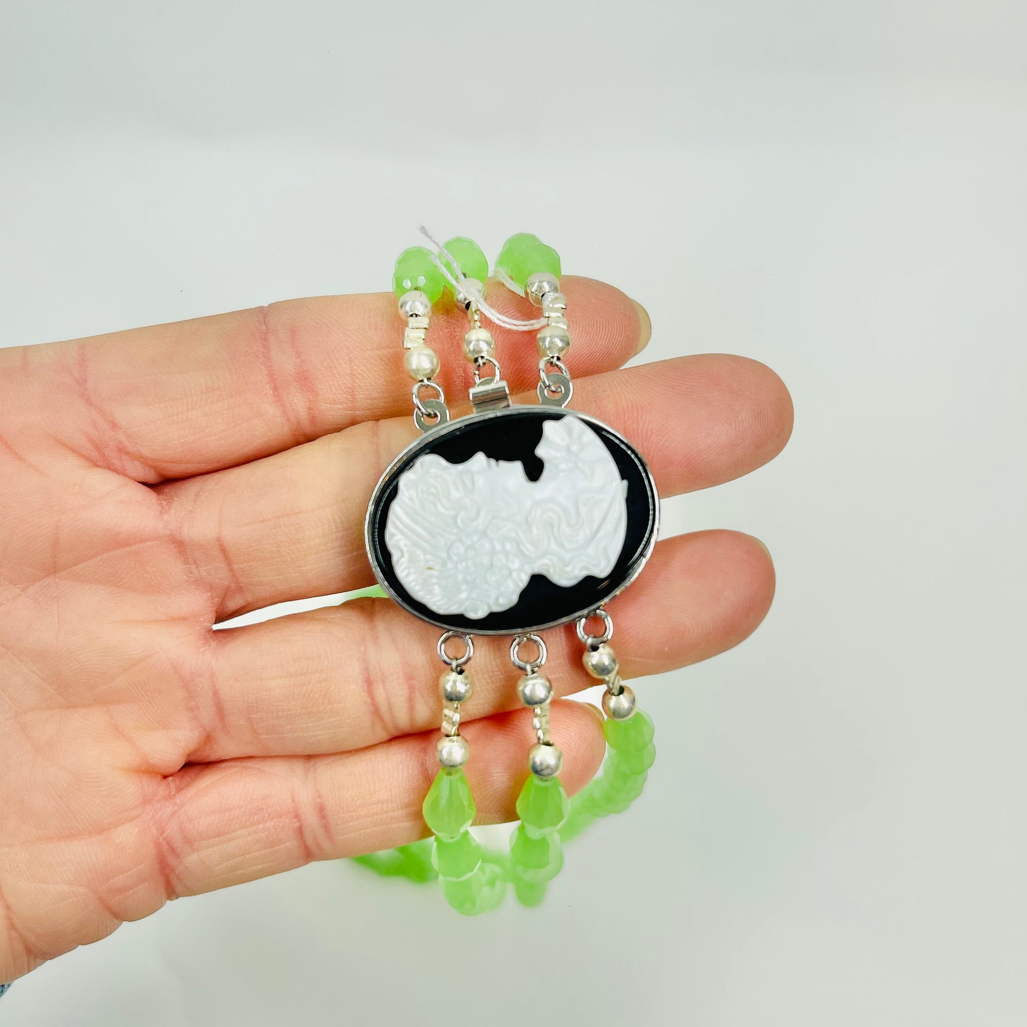 VINTAGE GREEN AUSTRIAN CRYSTAL BEADS NECKLACE WITH MOTHER OF PEARL CAMEO PENDANT