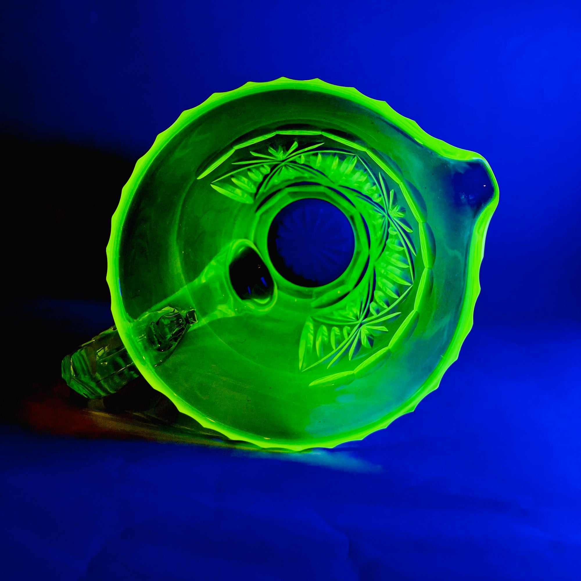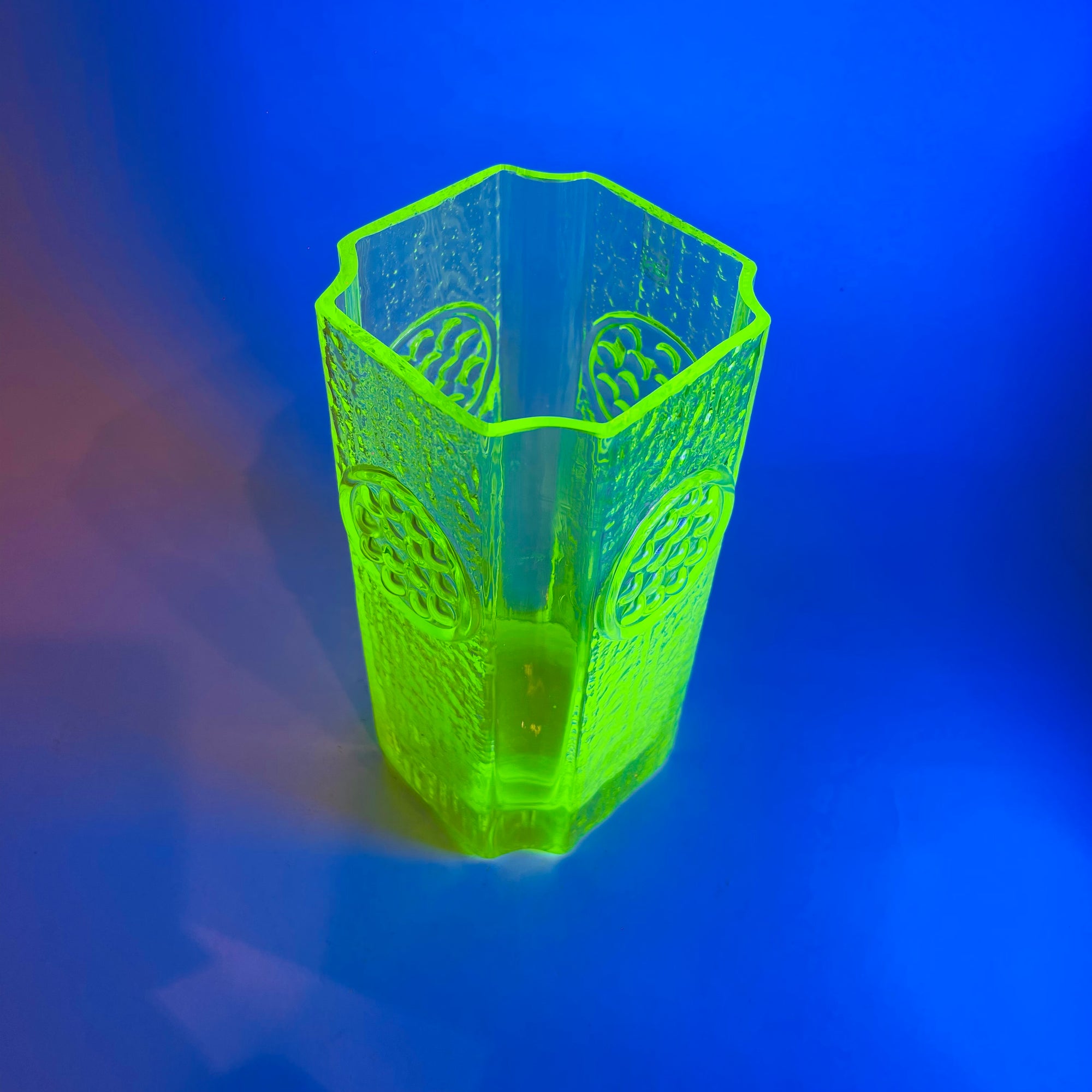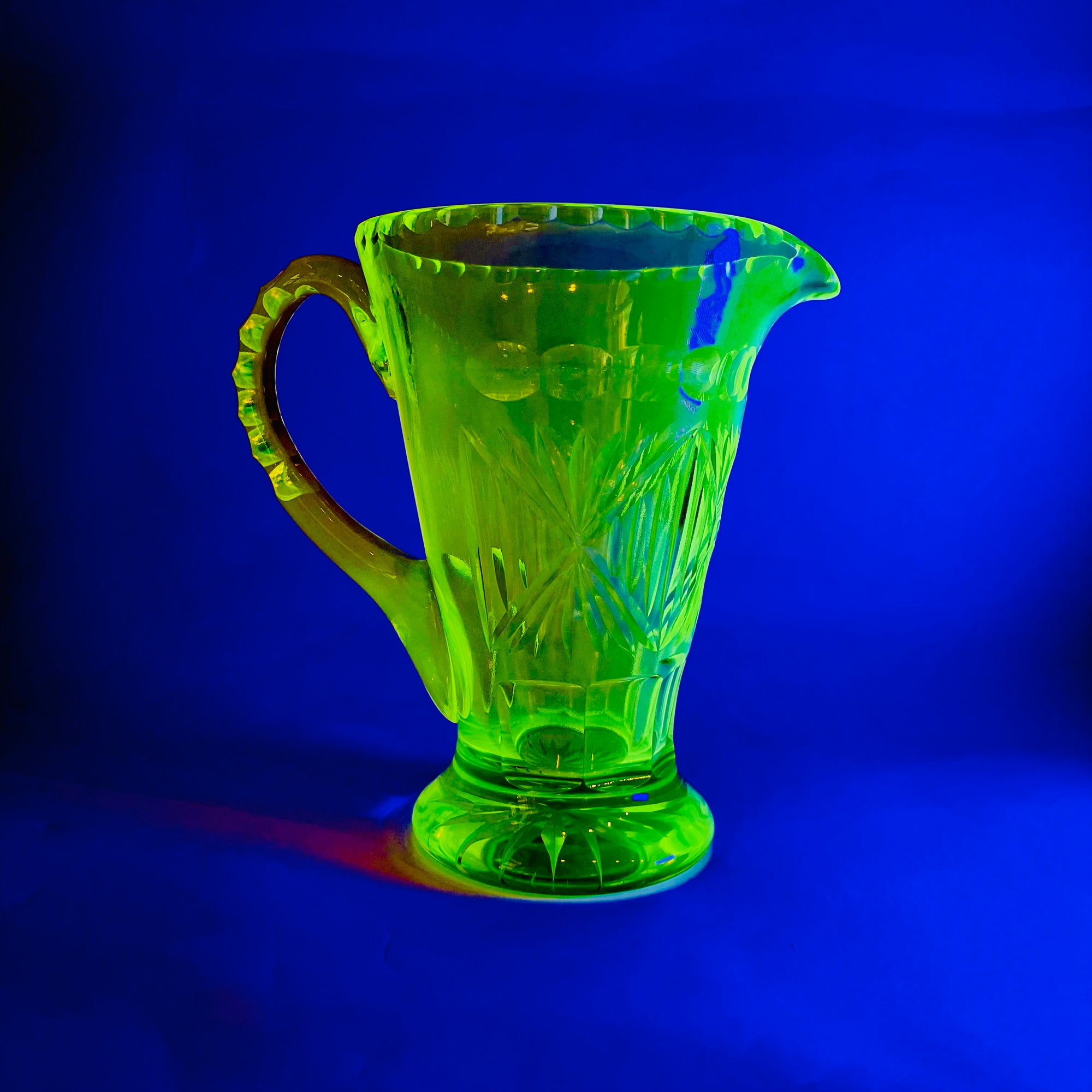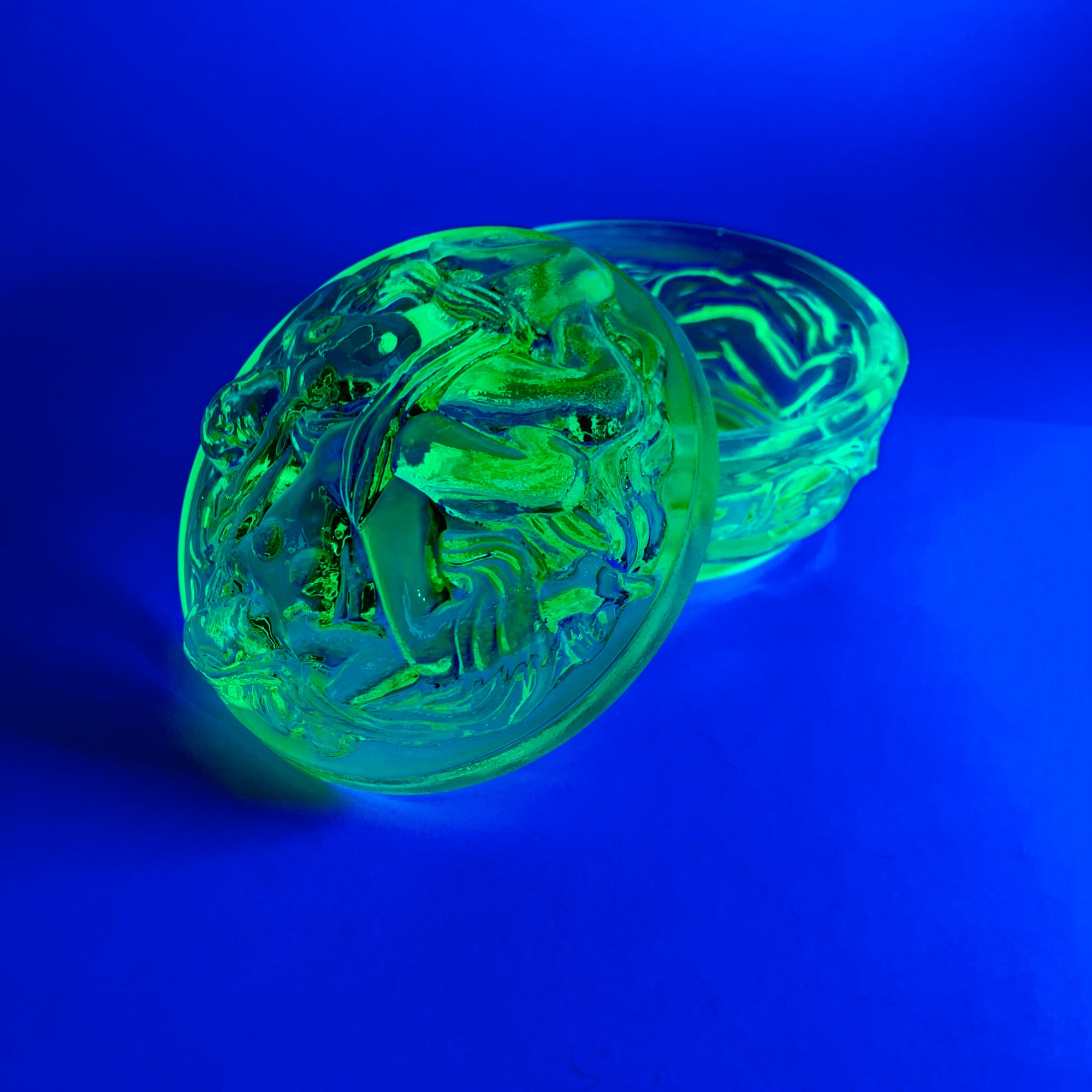 Uranium glass is a term used to describe any glassware that glows green under UV light. It is made by adding small amounts of uranium oxide to the glass mixture, usually the purpose is to give a strong green or yellow colour. Vaseline glass is a type of uranium glassware that has a pale yellow green colour similar to that of petroleum jelly, often with opalescent white sections. The two terms "vaseline" and "uranium" are often used to describe the same type of glass, but to be clear, while most vaseline glass has uranium content, there is a huge amount of uranium glass, of various shades of green and yellow, even blue, cream, and white, that does not fit the description of "vaseline". Uranium glass can be detected with a geiger counter, or an ultraviolet (UV) light. The fact that uranium glass glows bright green under UV light, has led to uranium glass becoming popular with collectors.