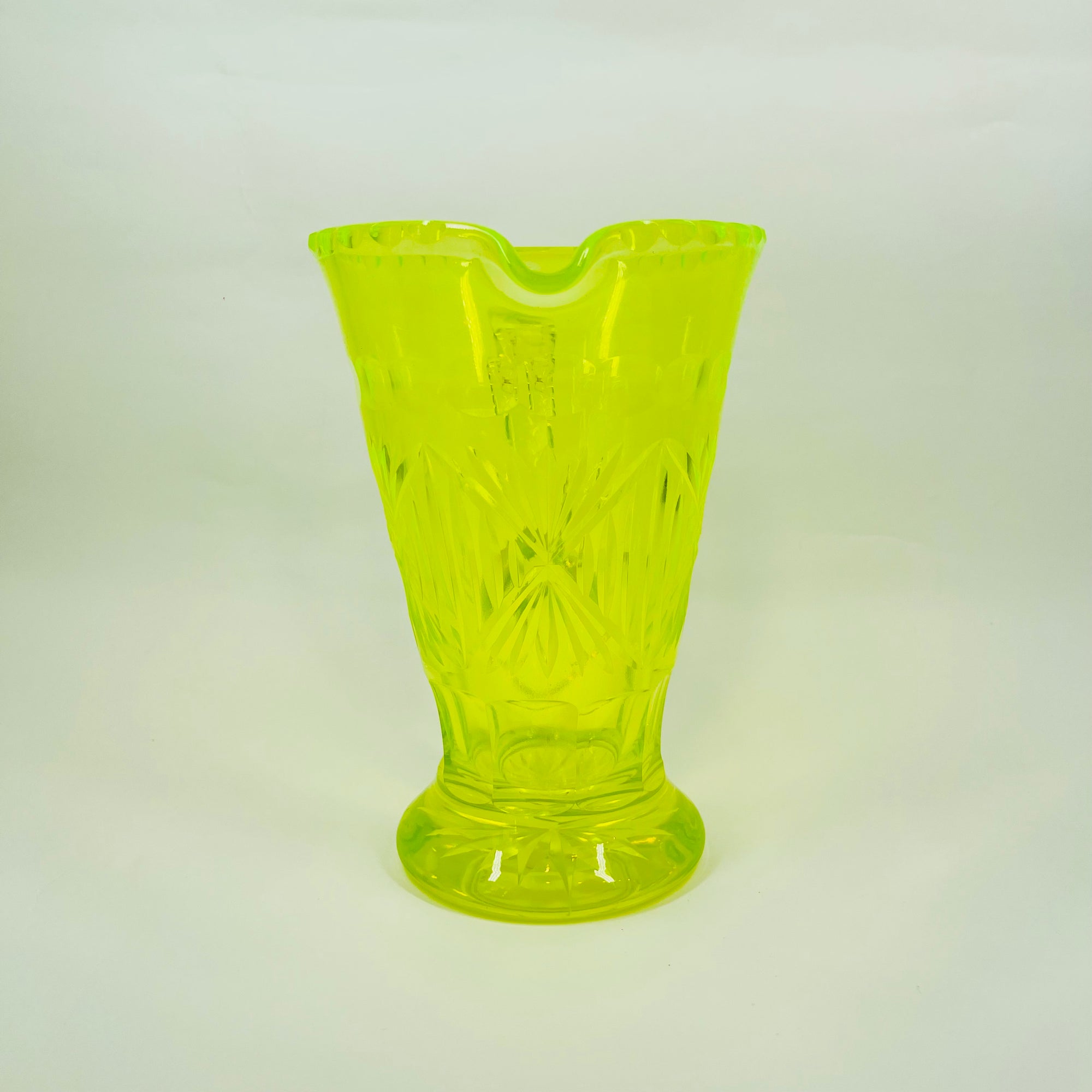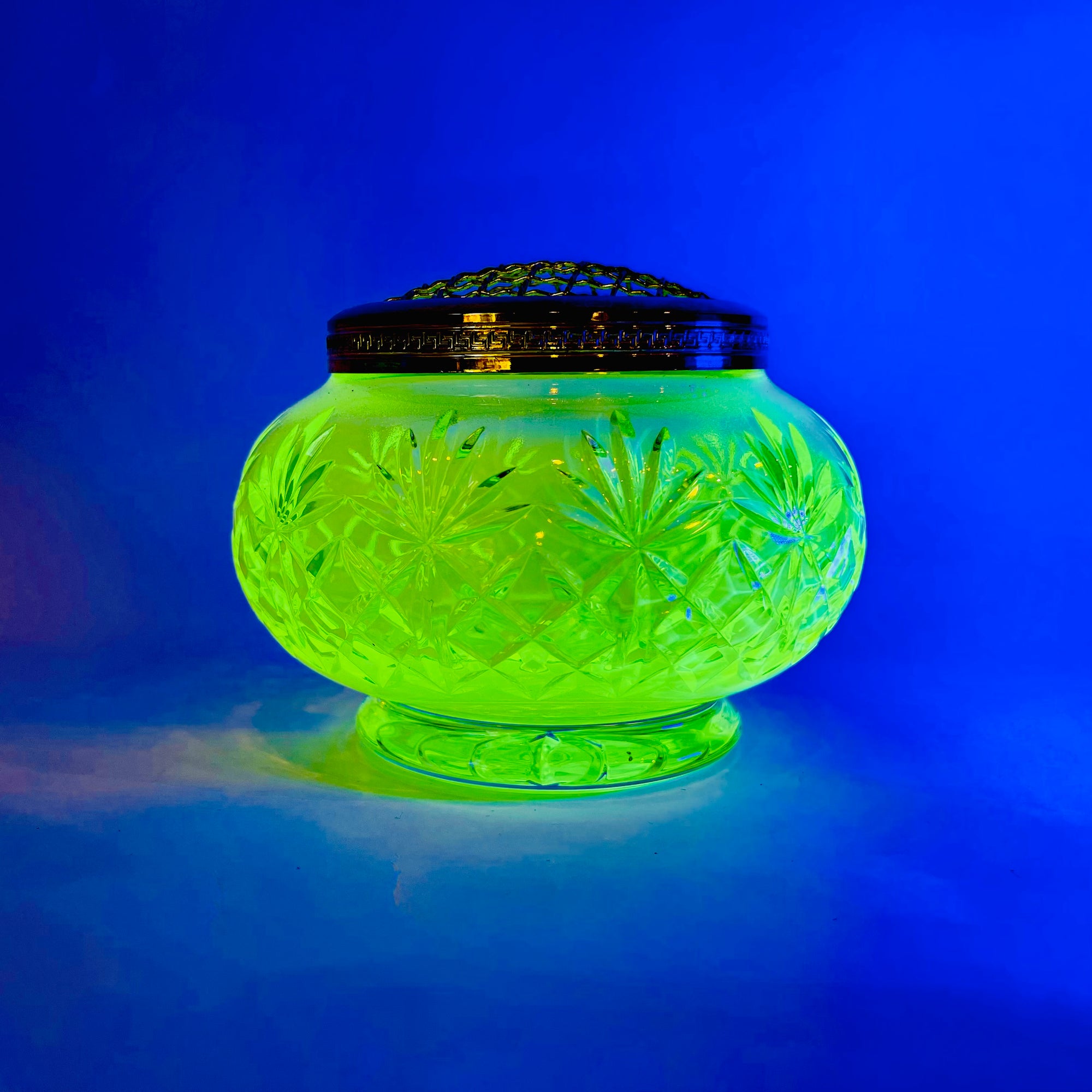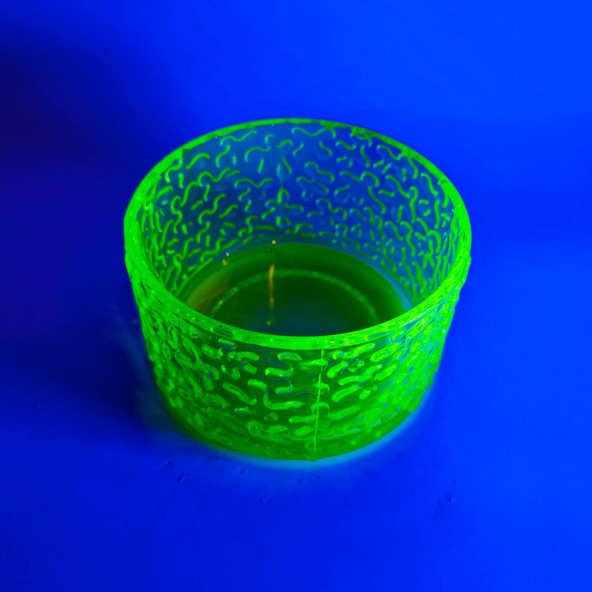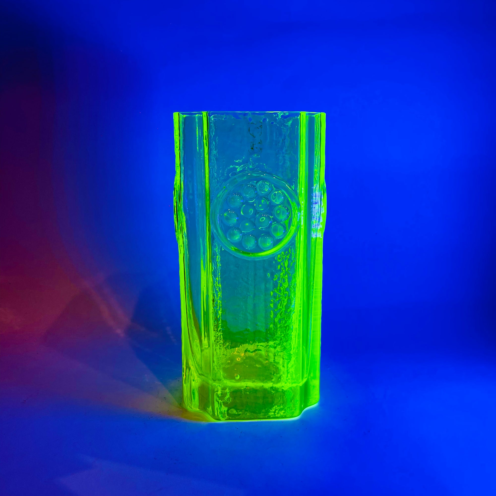 Uranium glass is a term used to describe any glassware that glows green under UV light. It is made by adding small amounts of uranium oxide to the glass mixture, usually the purpose is to give a strong green or yellow colour. Vaseline glass is a type of uranium glassware that has a pale yellow green colour similar to that of petroleum jelly, often with opalescent white sections. The two terms "vaseline" and "uranium" are often used to describe the same type of glass, but to be clear, while most vaseline glass has uranium content, there is a huge amount of uranium glass, of various shades of green and yellow, even blue, cream, and white, that does not fit the description of "vaseline". Uranium glass can be detected with a geiger counter, or an ultraviolet (UV) light. The fact that uranium glass glows bright green under UV light, has led to uranium glass becoming popular with collectors.