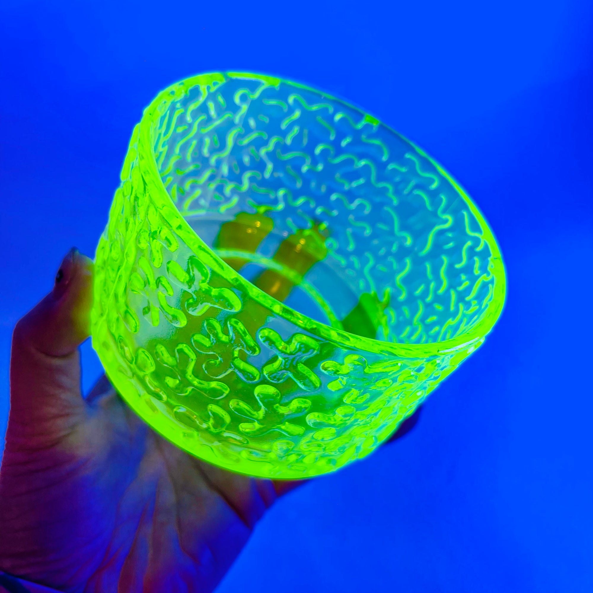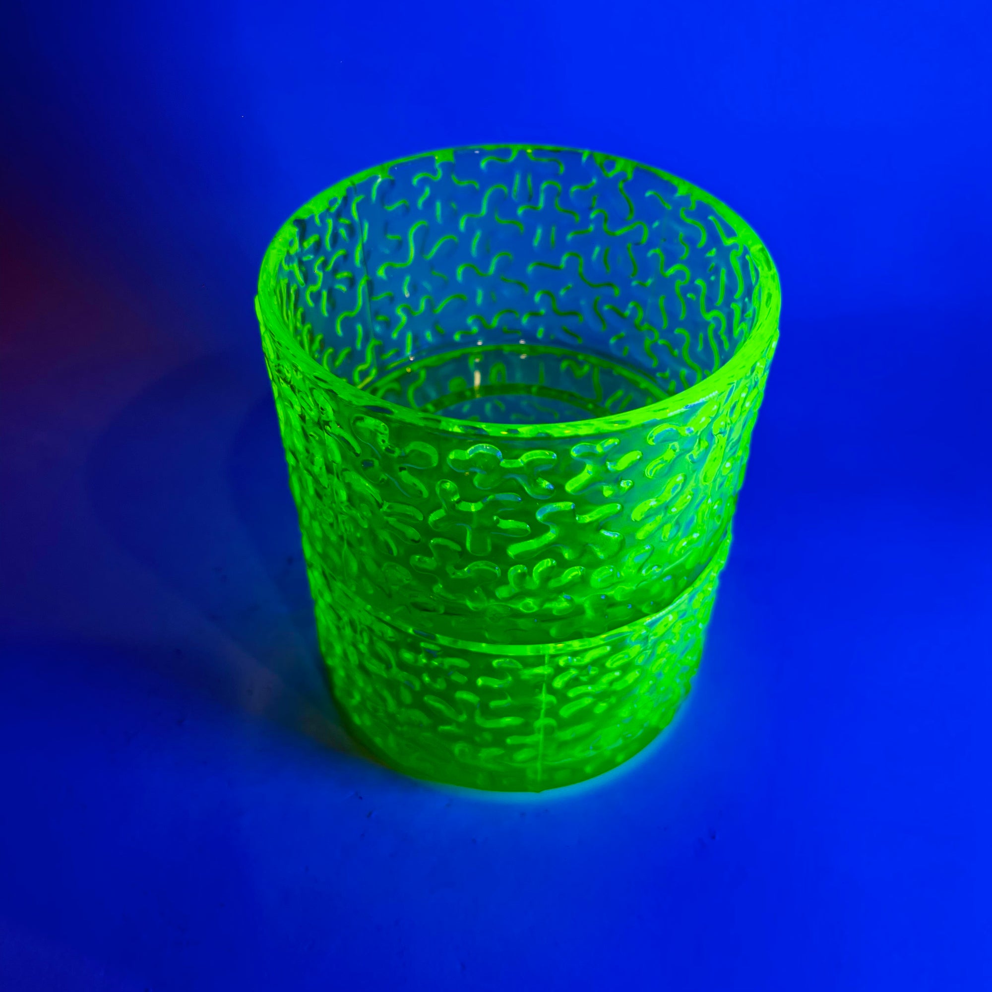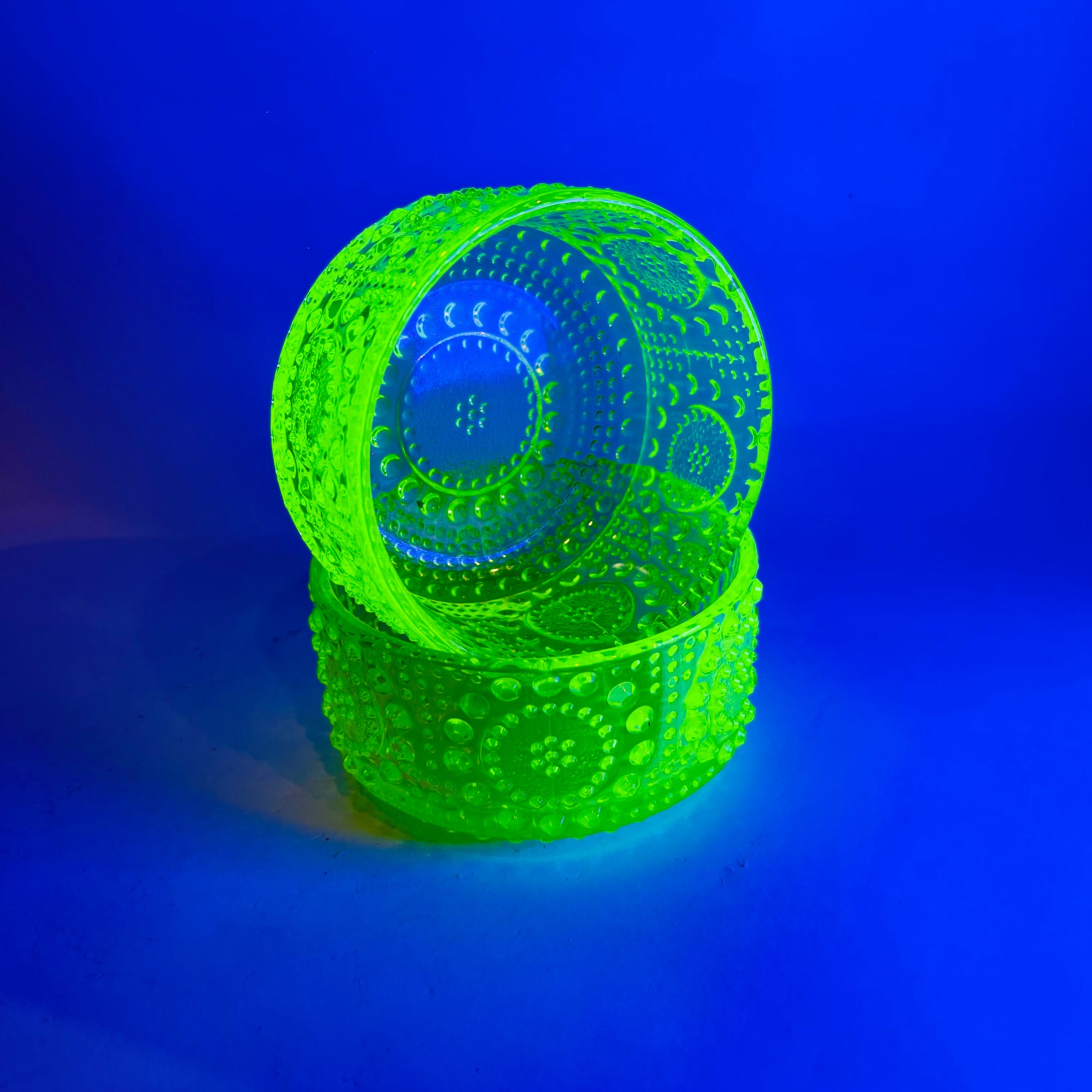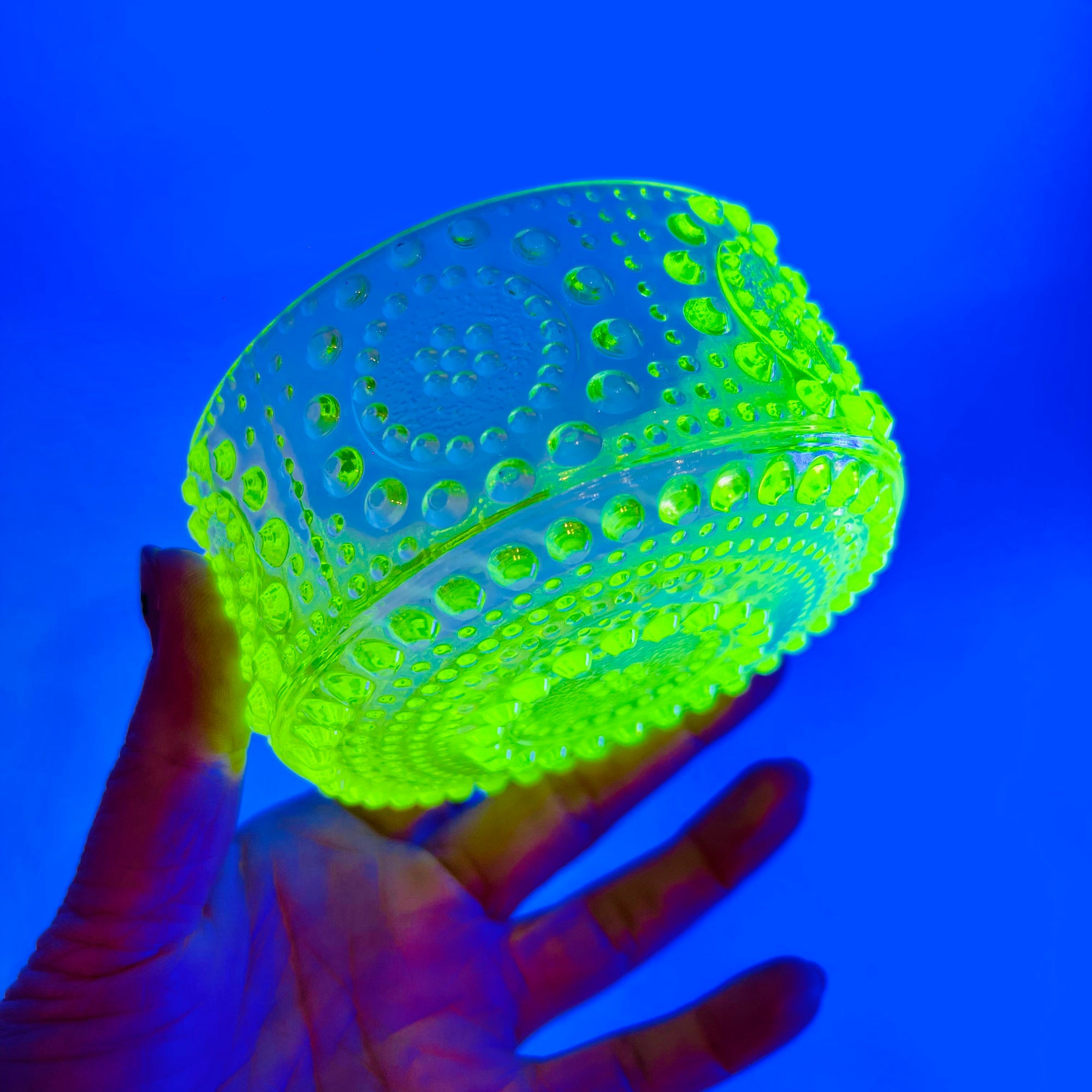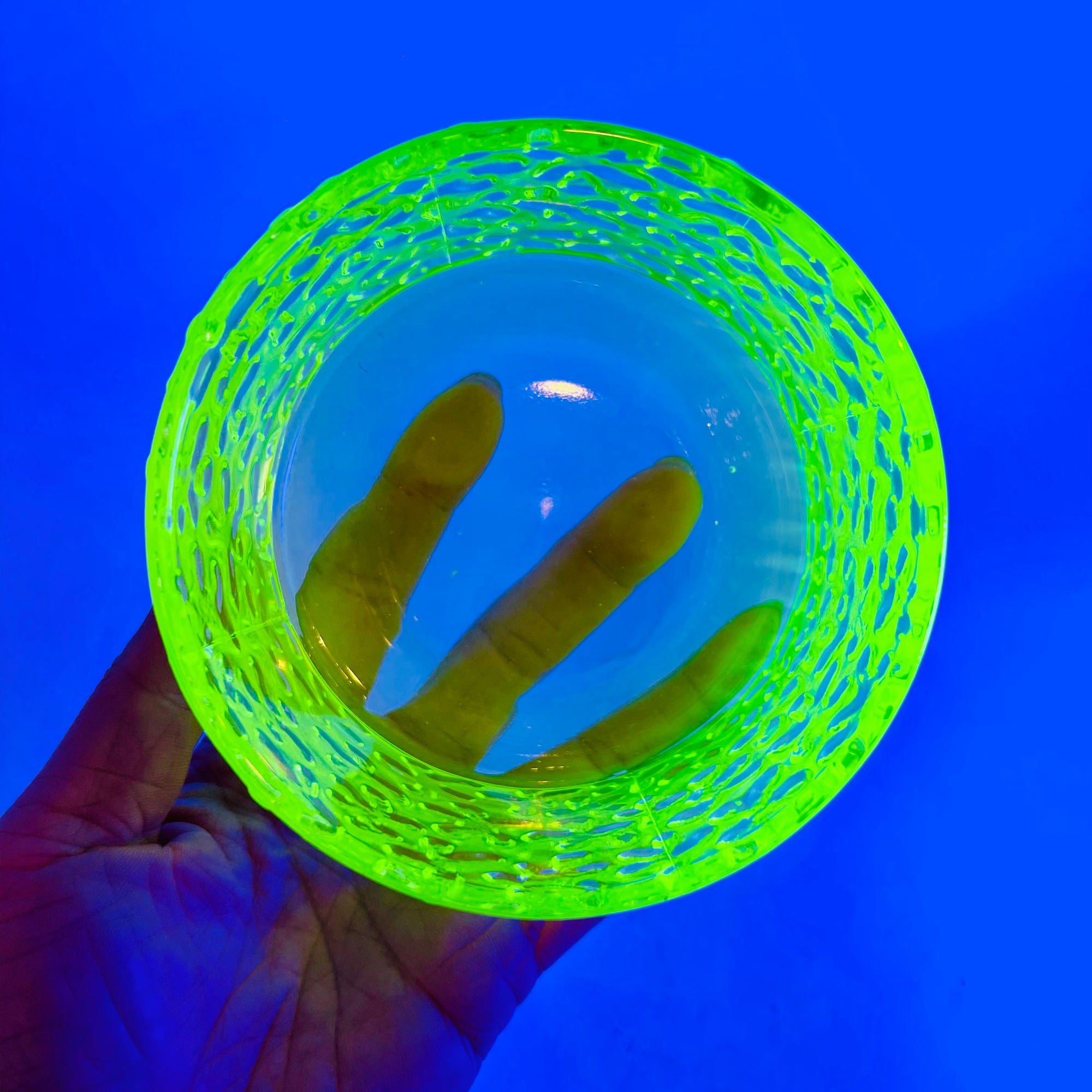 Uranium glass is a term used to describe any glassware that glows green under UV light. It is made by adding small amounts of uranium oxide to the glass mixture, usually the purpose is to give a strong green or yellow colour. Vaseline glass is a type of uranium glassware that has a pale yellow green colour similar to that of petroleum jelly, often with opalescent white sections. The two terms "vaseline" and "uranium" are often used to describe the same type of glass, but to be clear, while most vaseline glass has uranium content, there is a huge amount of uranium glass, of various shades of green and yellow, even blue, cream, and white, that does not fit the description of "vaseline". Uranium glass can be detected with a geiger counter, or an ultraviolet (UV) light. The fact that uranium glass glows bright green under UV light, has led to uranium glass becoming popular with collectors.