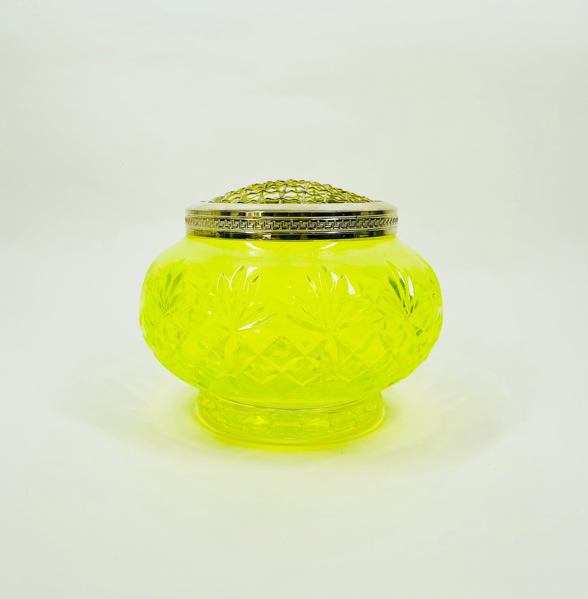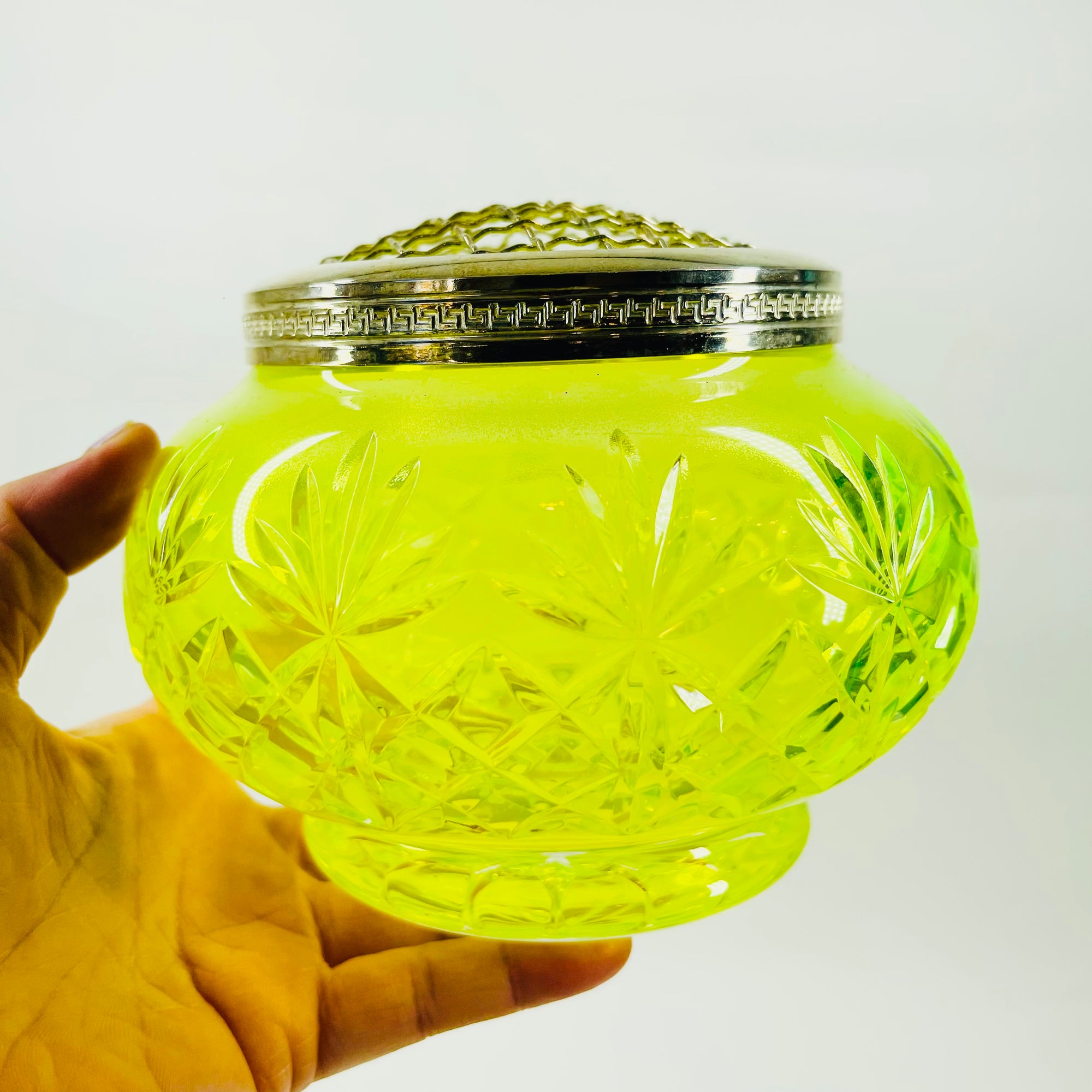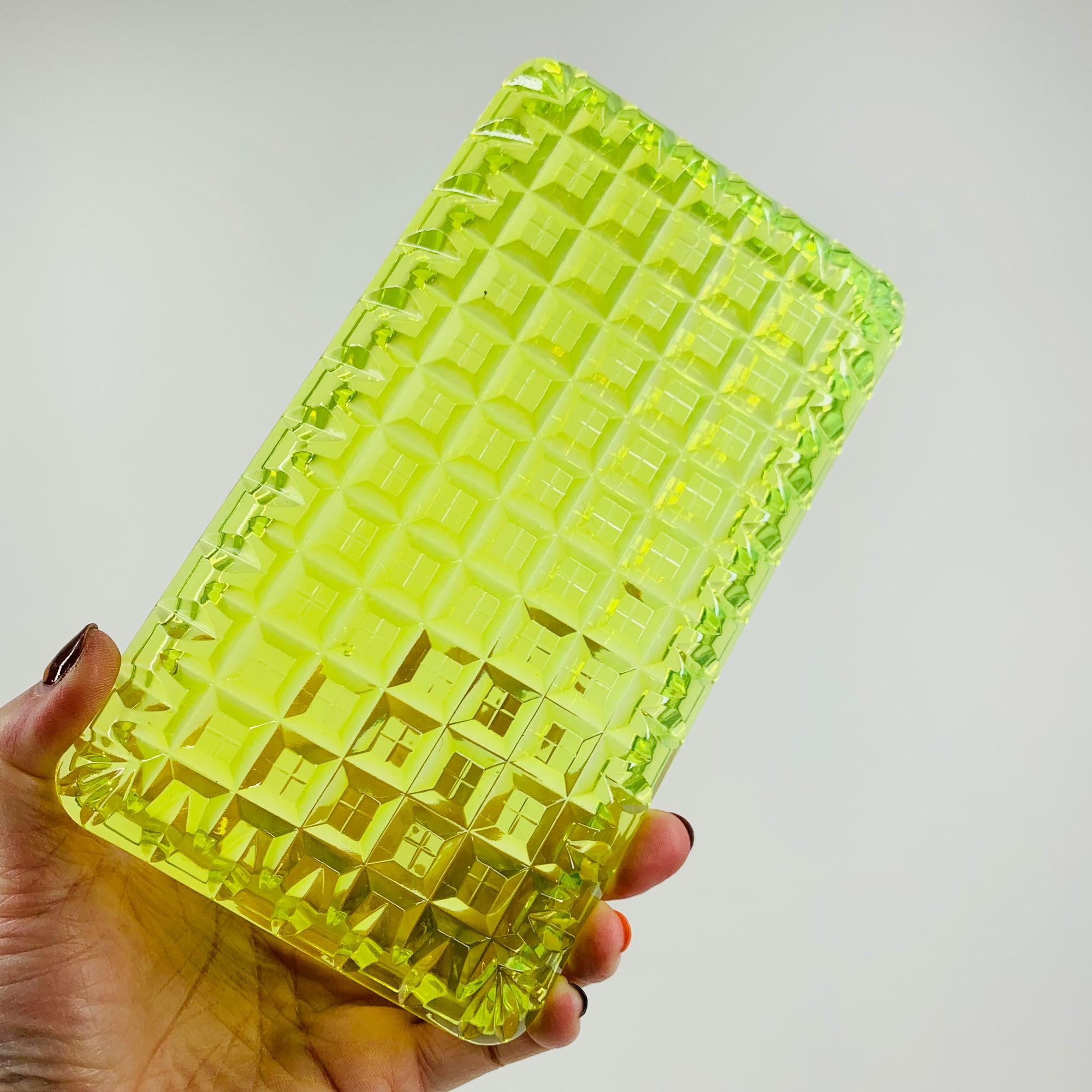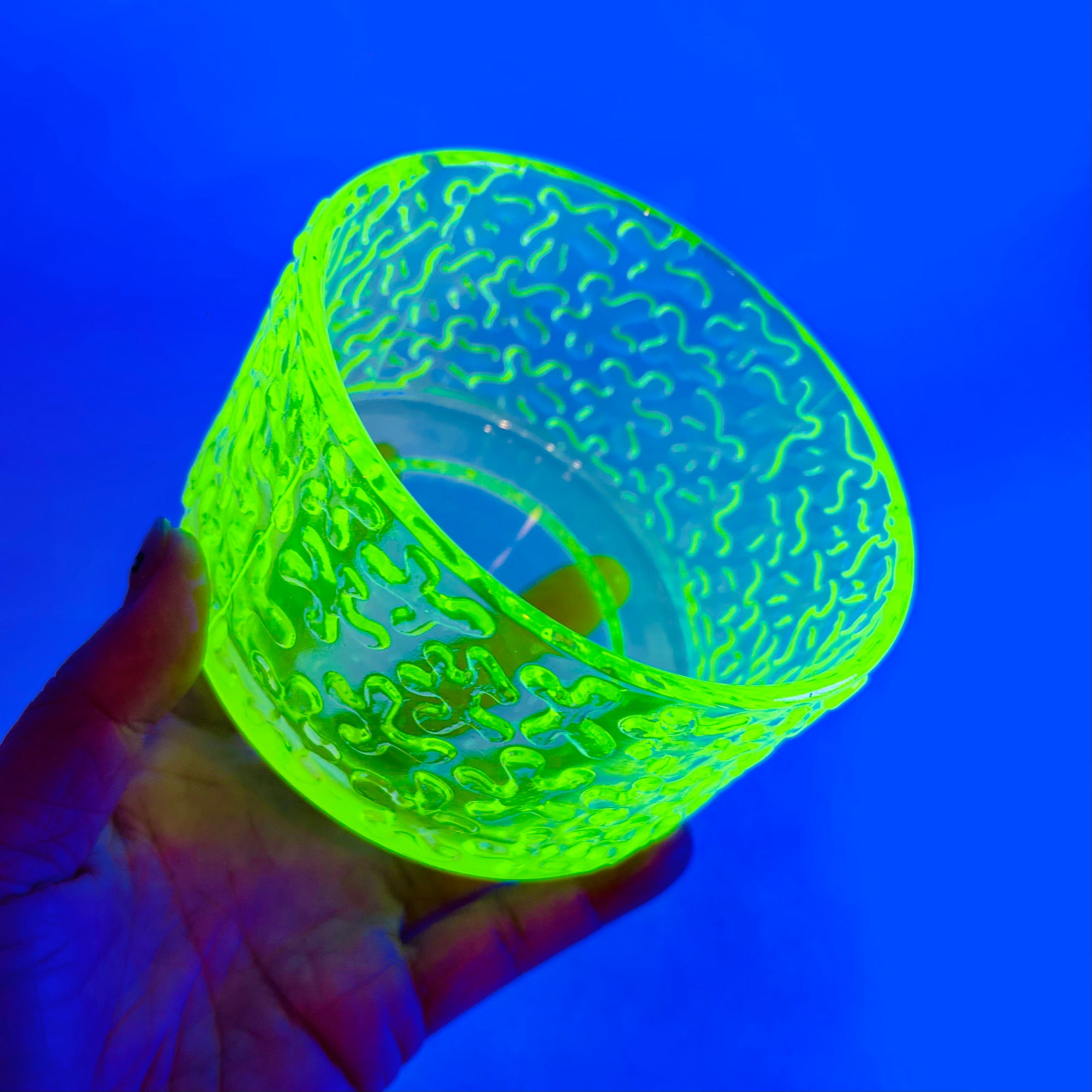 Uranium glass is a term used to describe any glassware that glows green under UV light. It is made by adding small amounts of uranium oxide to the glass mixture, usually the purpose is to give a strong green or yellow colour. Vaseline glass is a type of uranium glassware that has a pale yellow green colour similar to that of petroleum jelly, often with opalescent white sections. The two terms "vaseline" and "uranium" are often used to describe the same type of glass, but to be clear, while most vaseline glass has uranium content, there is a huge amount of uranium glass, of various shades of green and yellow, even blue, cream, and white, that does not fit the description of "vaseline". Uranium glass can be detected with a geiger counter, or an ultraviolet (UV) light. The fact that uranium glass glows bright green under UV light, has led to uranium glass becoming popular with collectors.