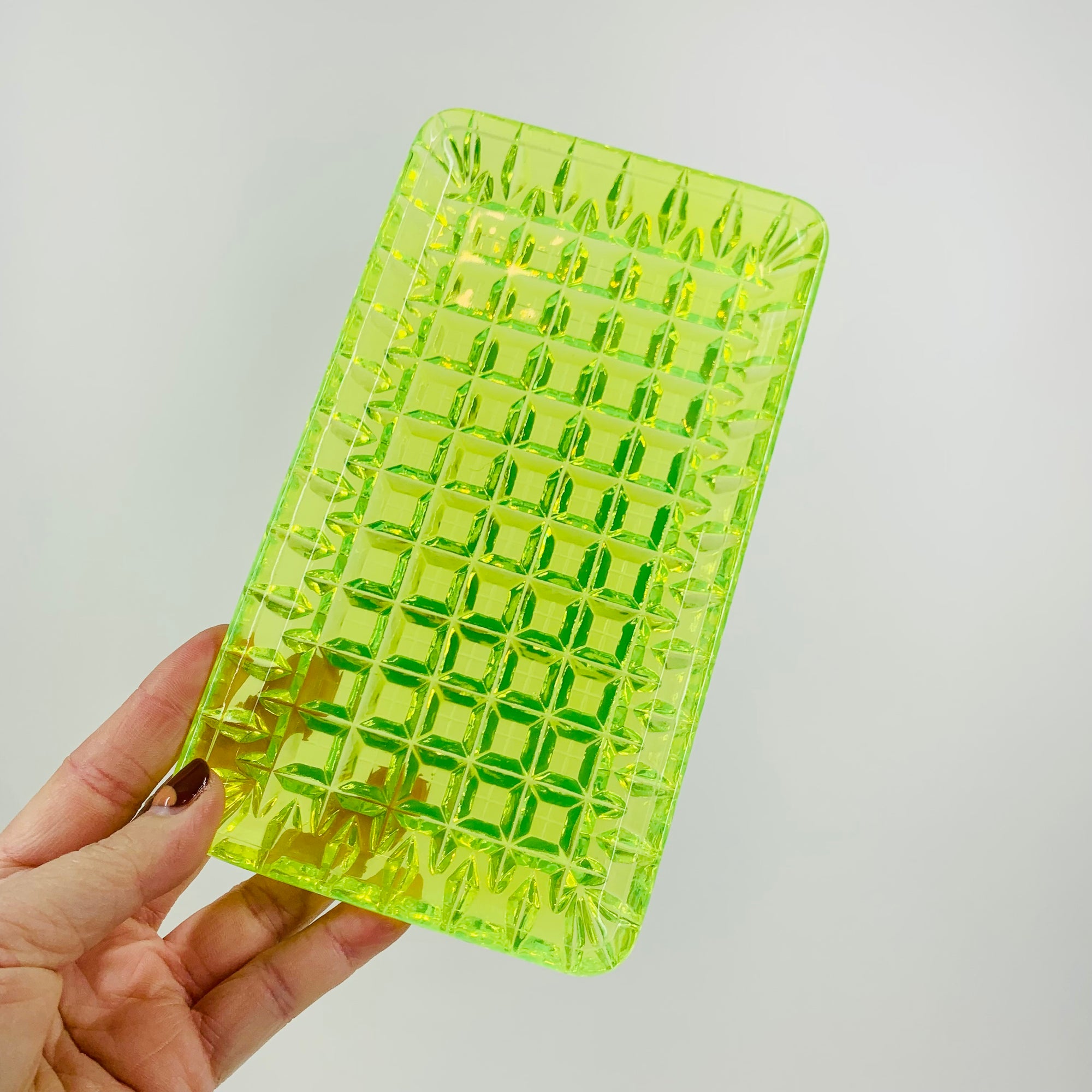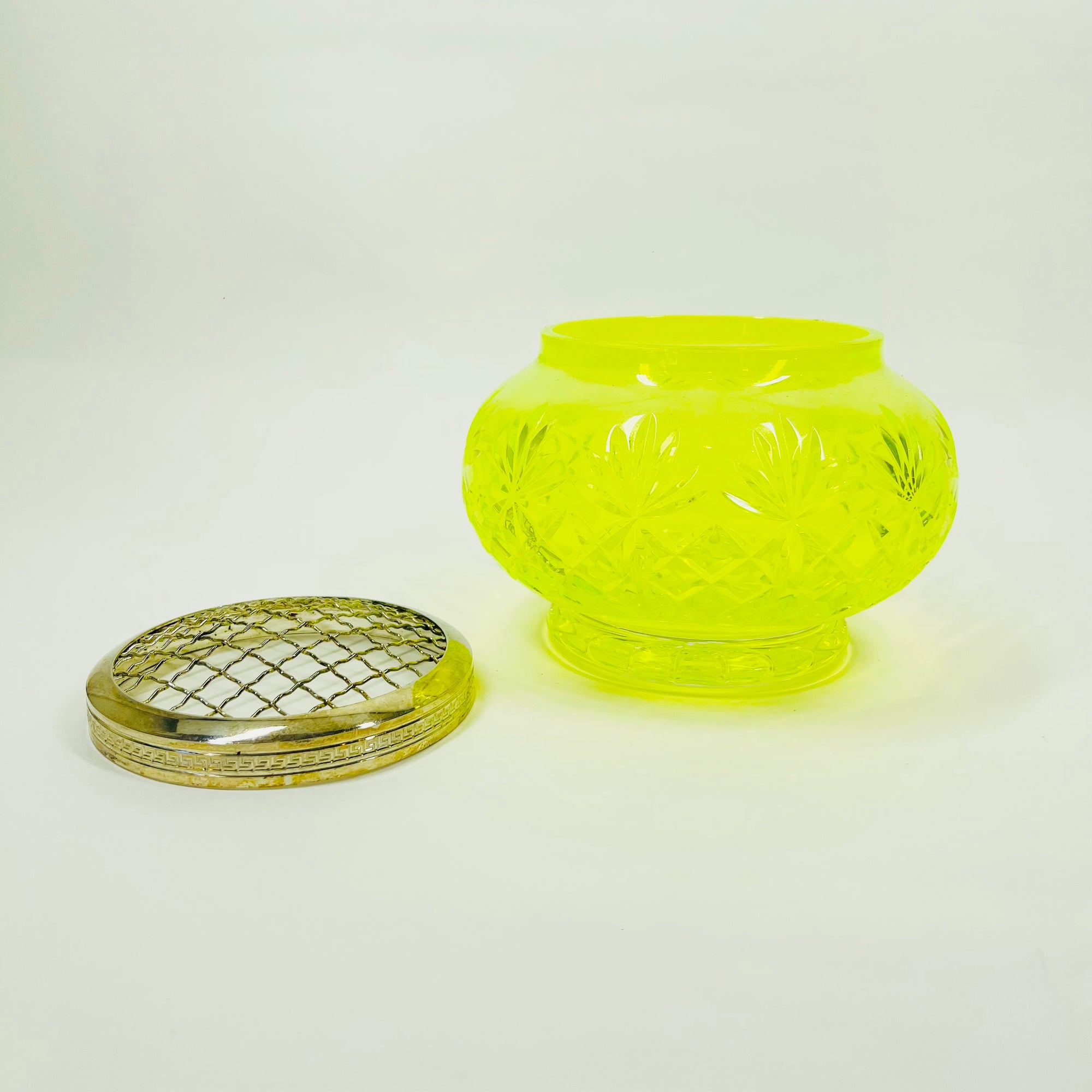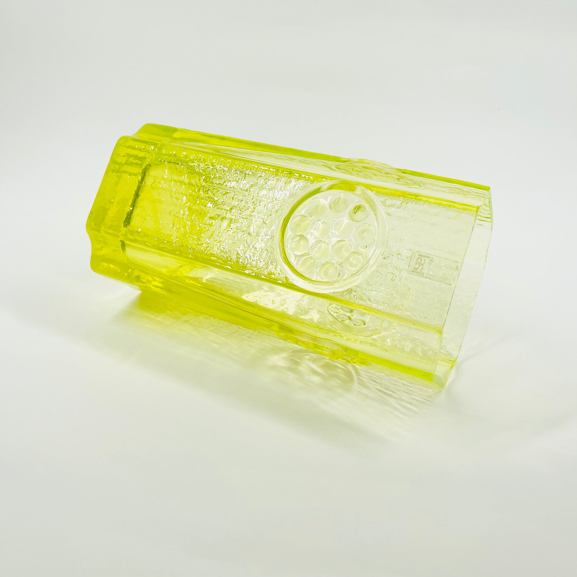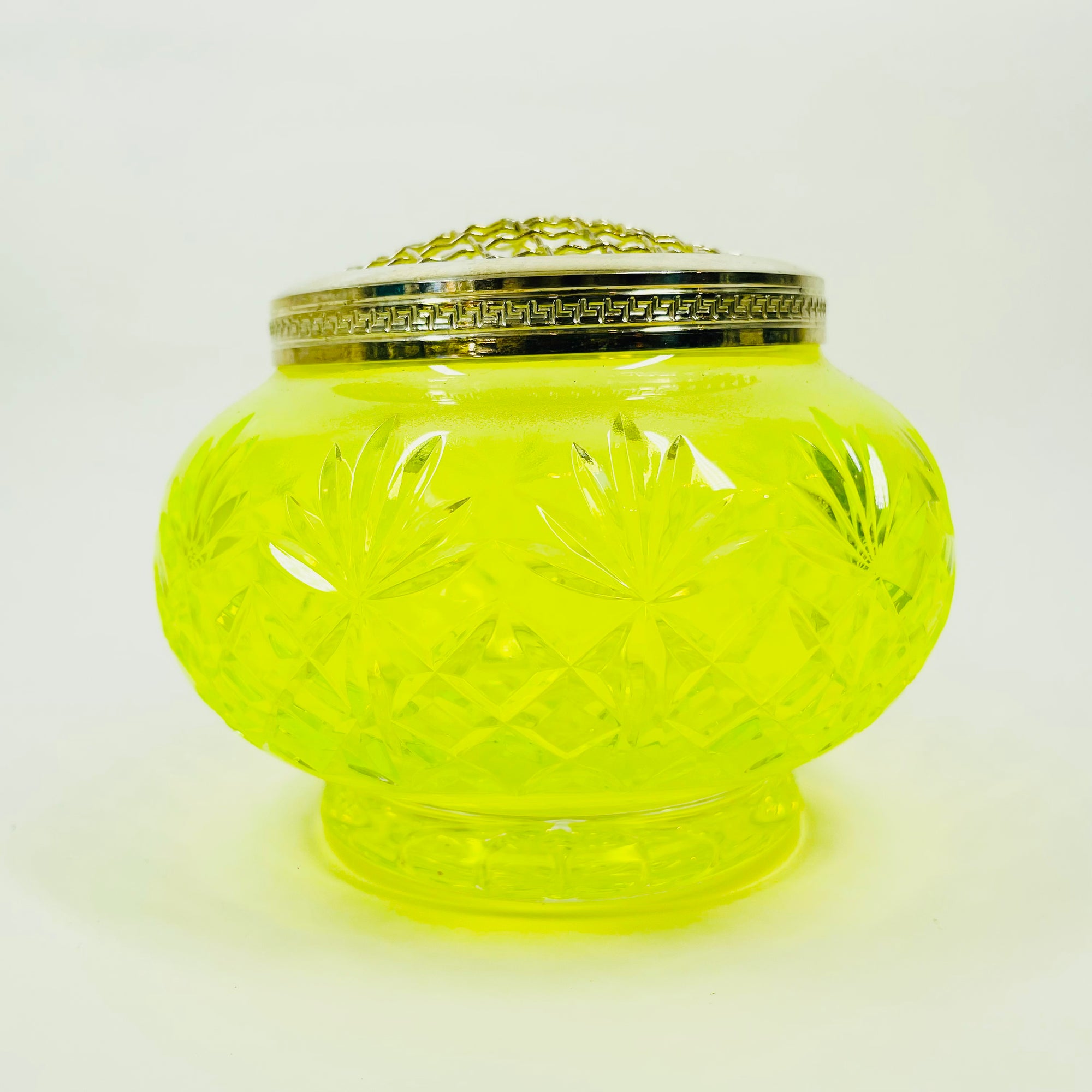 Uranium glass is a term used to describe any glassware that glows green under UV light. It is made by adding small amounts of uranium oxide to the glass mixture, usually the purpose is to give a strong green or yellow colour. Vaseline glass is a type of uranium glassware that has a pale yellow green colour similar to that of petroleum jelly, often with opalescent white sections. The two terms "vaseline" and "uranium" are often used to describe the same type of glass, but to be clear, while most vaseline glass has uranium content, there is a huge amount of uranium glass, of various shades of green and yellow, even blue, cream, and white, that does not fit the description of "vaseline". Uranium glass can be detected with a geiger counter, or an ultraviolet (UV) light. The fact that uranium glass glows bright green under UV light, has led to uranium glass becoming popular with collectors.