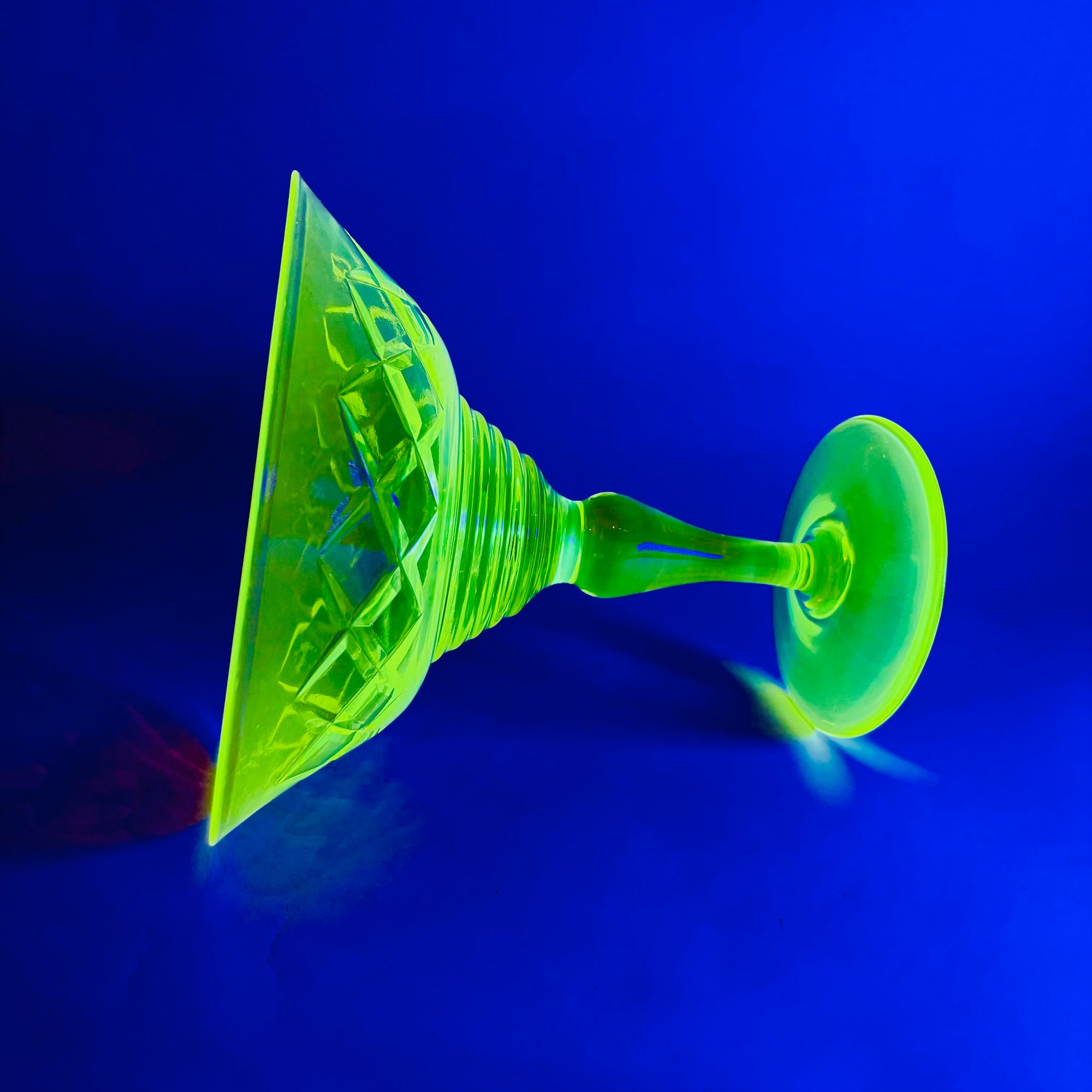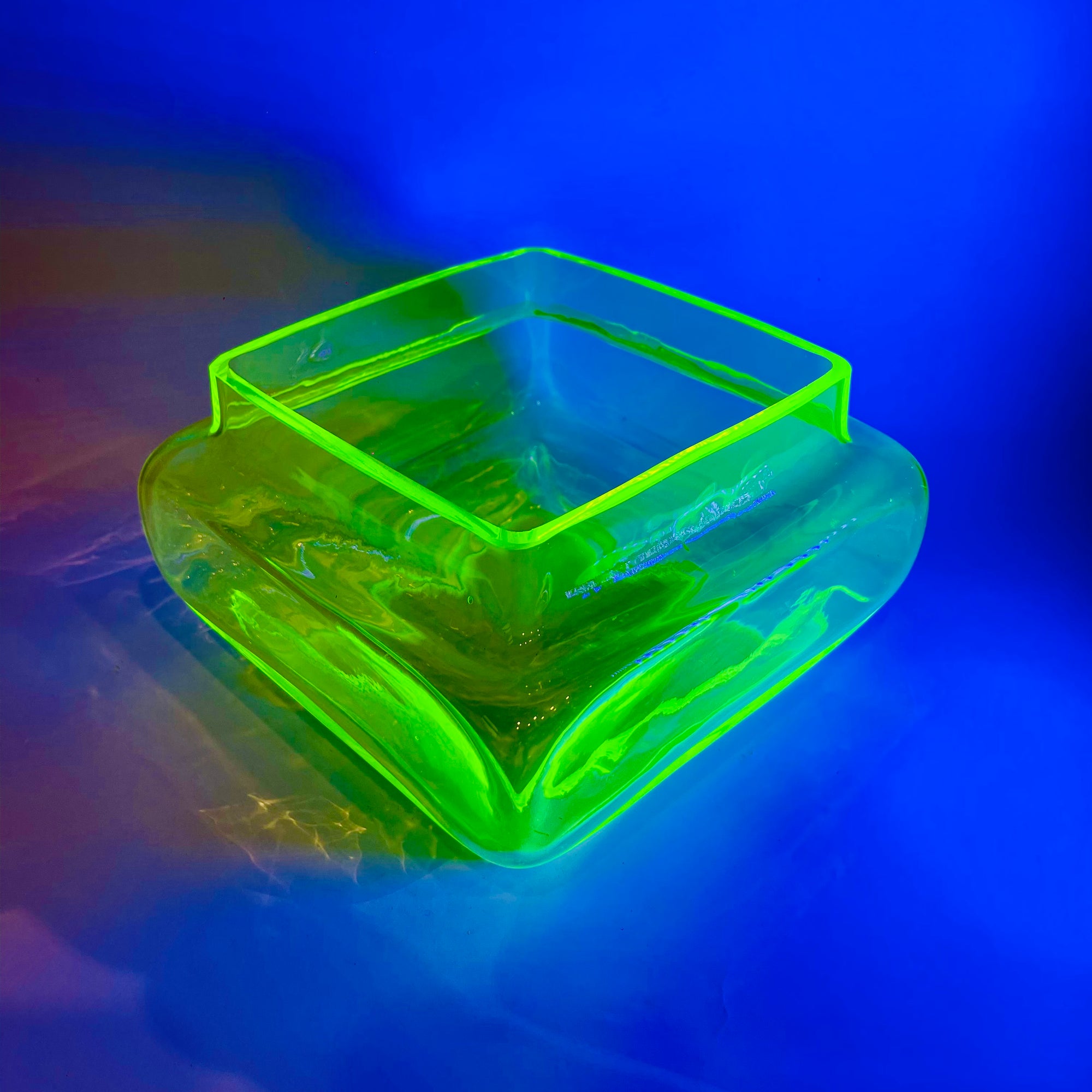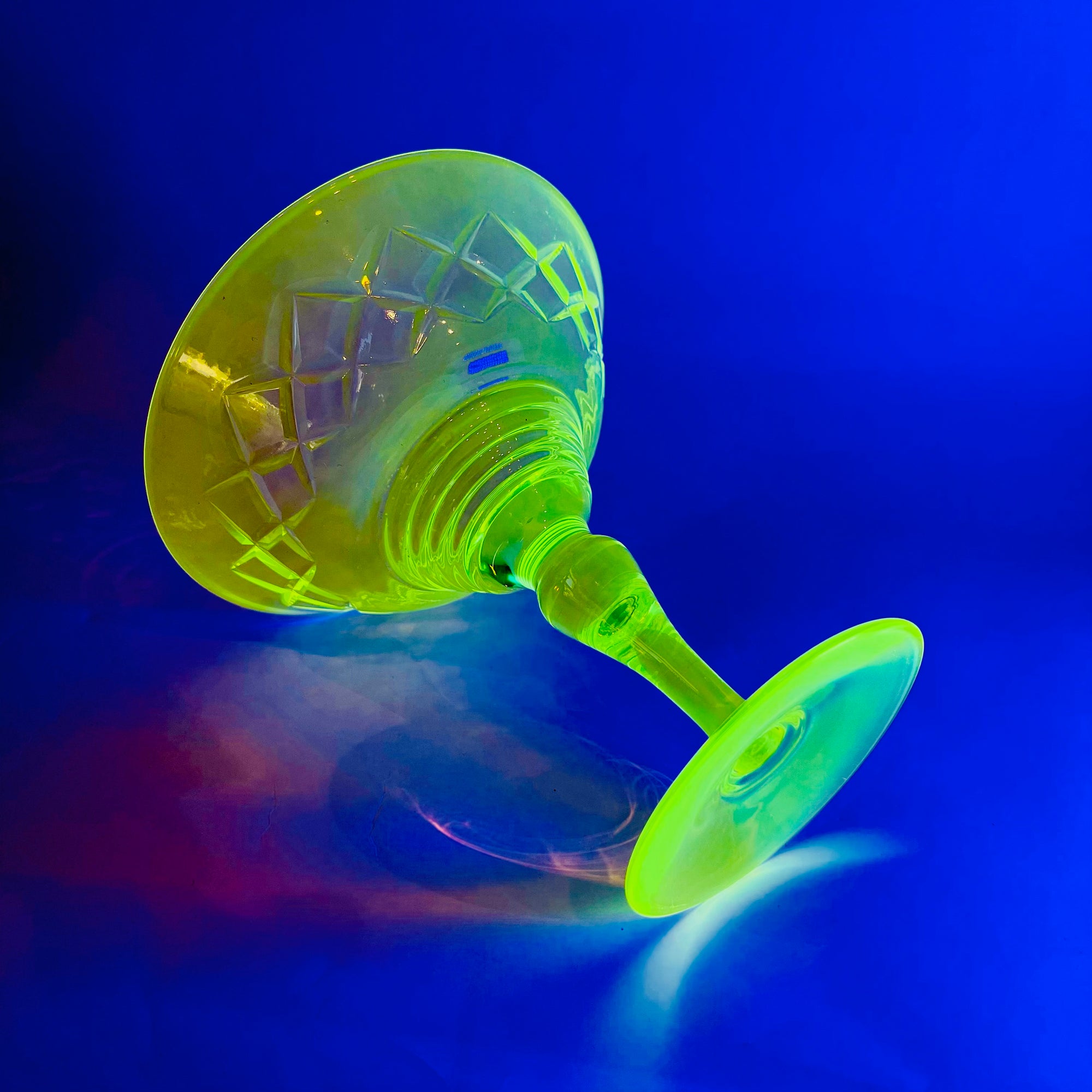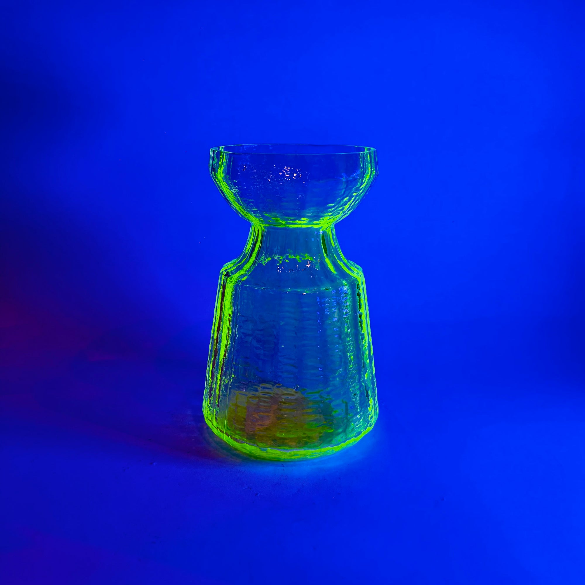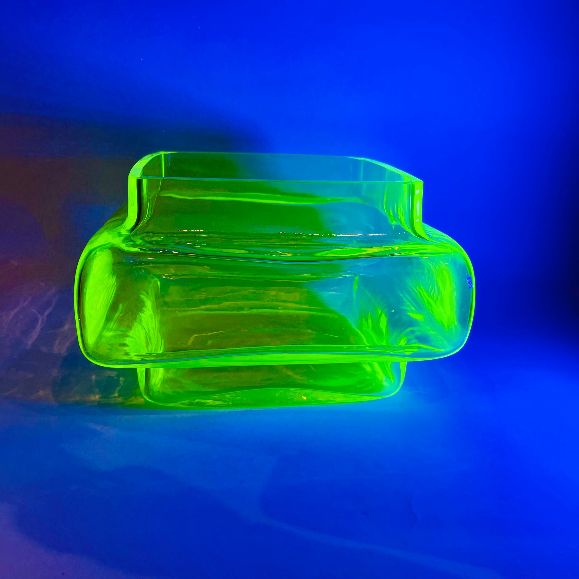 We recommend that you view our display at night when all the uranium glass pieces are lit up to have the full experience. We are also posting daily on our Instagram and Facebook page editorial photos of each item where we discuss at length about how they were made and the history behind their maker.