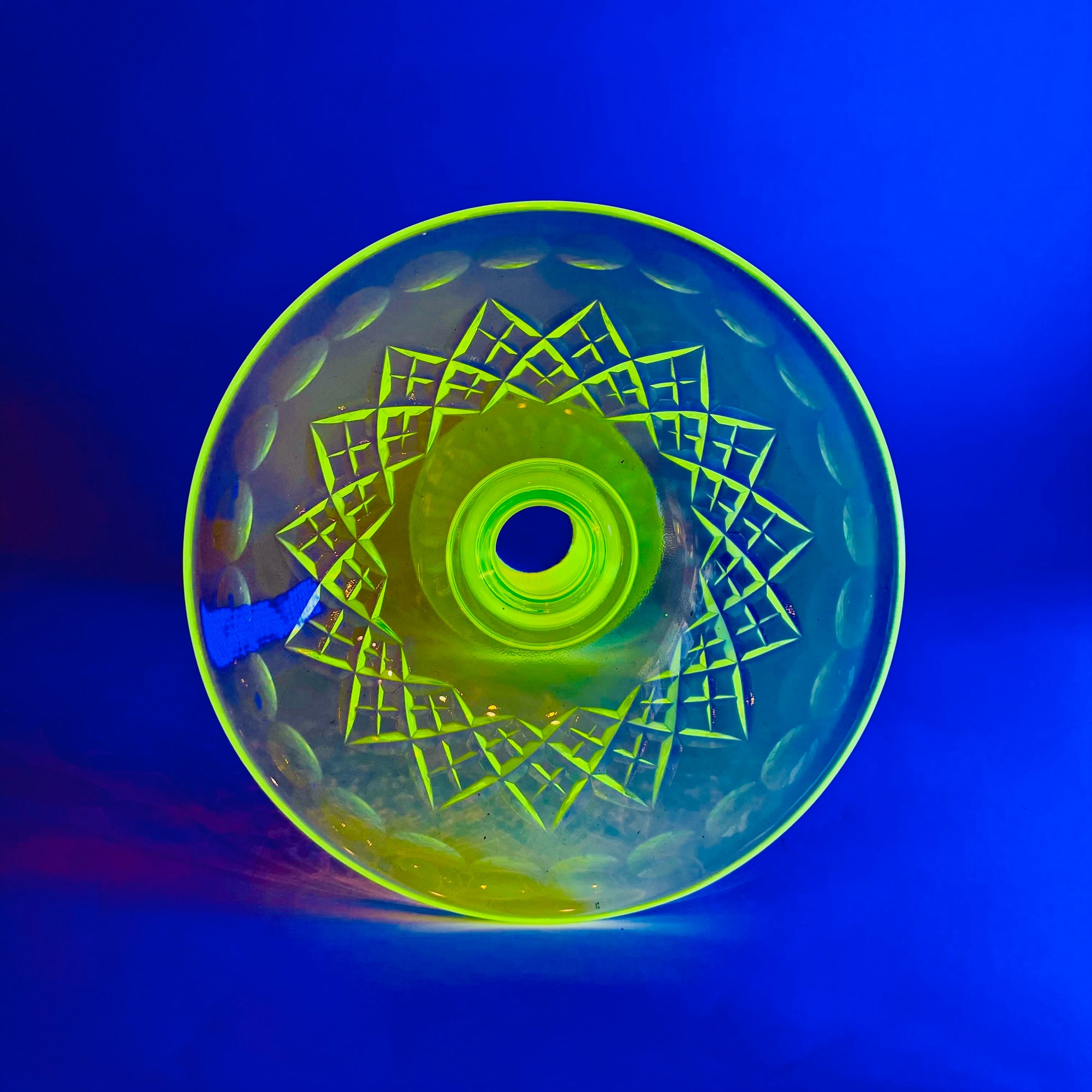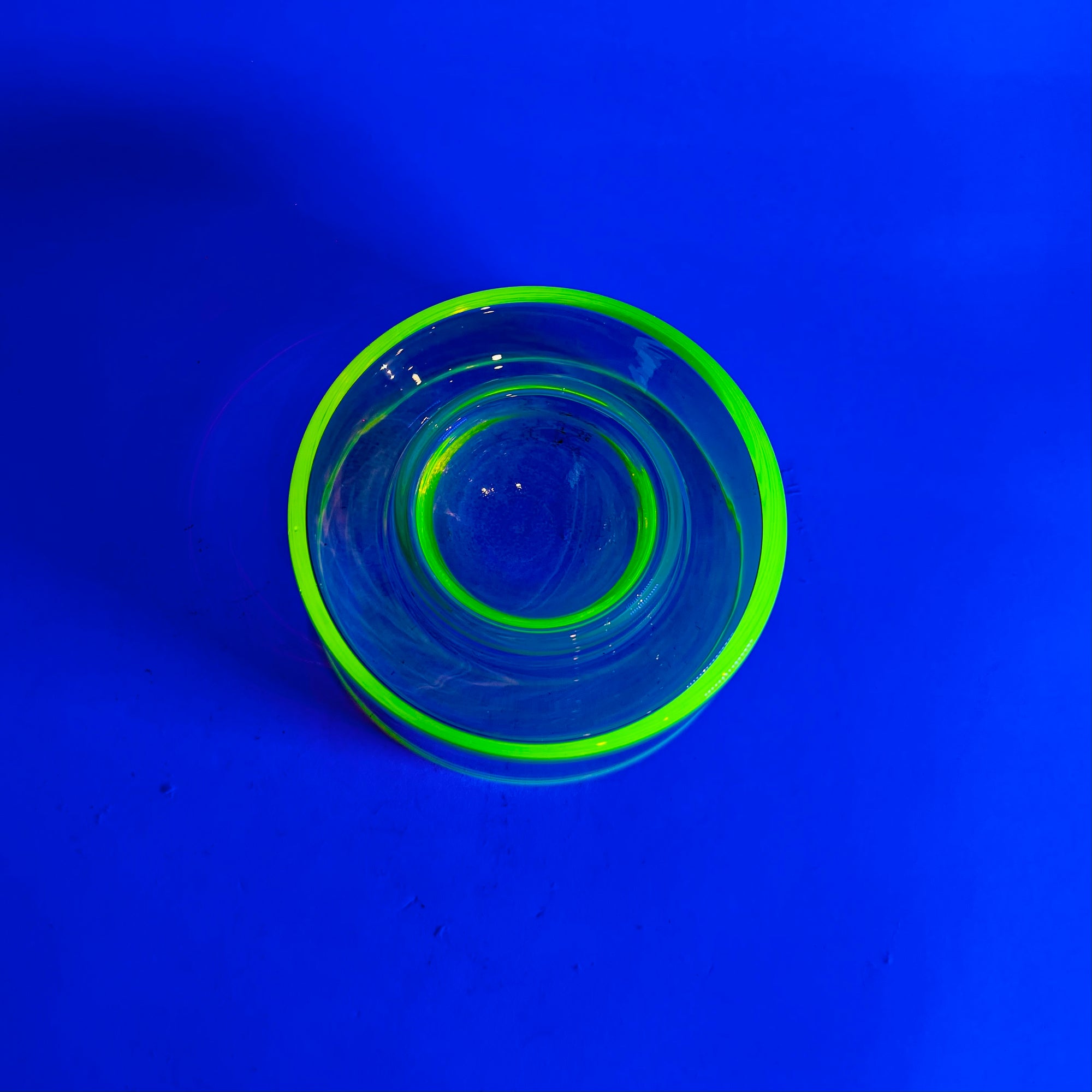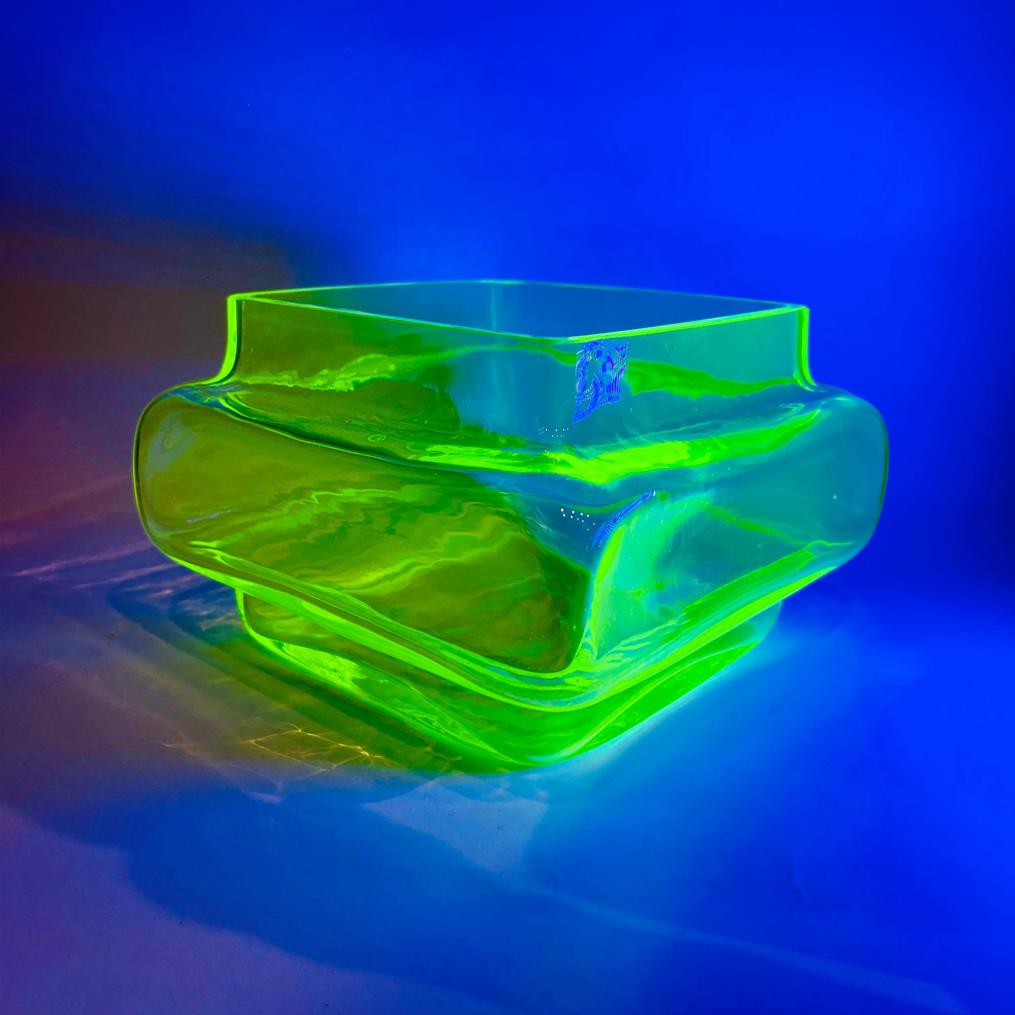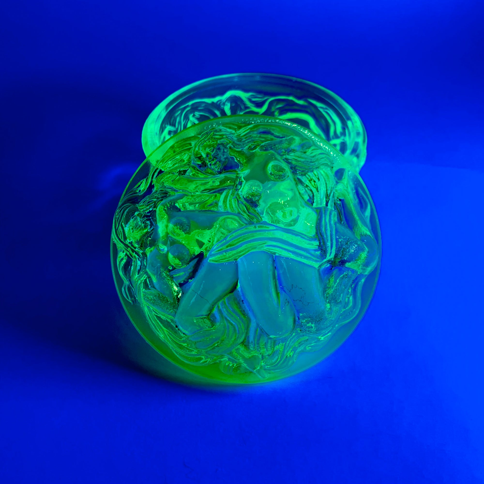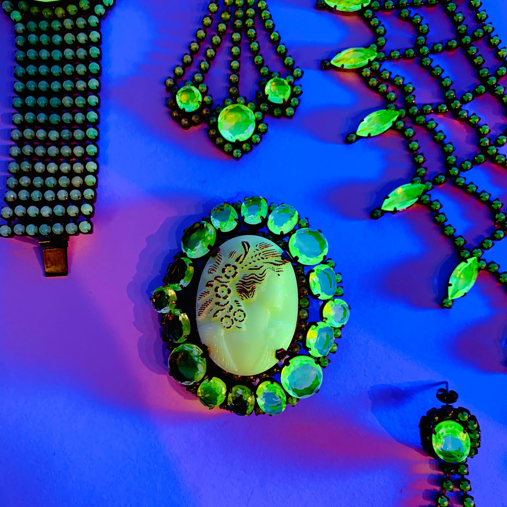 We recommend that you view our display at night when all the uranium glass pieces are lit up to have the full experience. We are also posting daily on our Instagram and Facebook page editorial photos of each item where we discuss at length about how they were made and the history behind their maker.