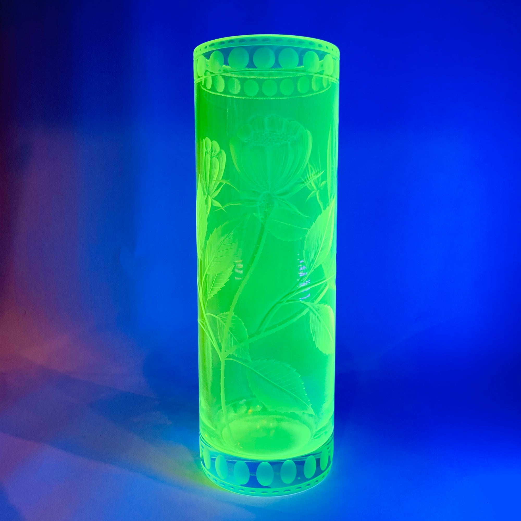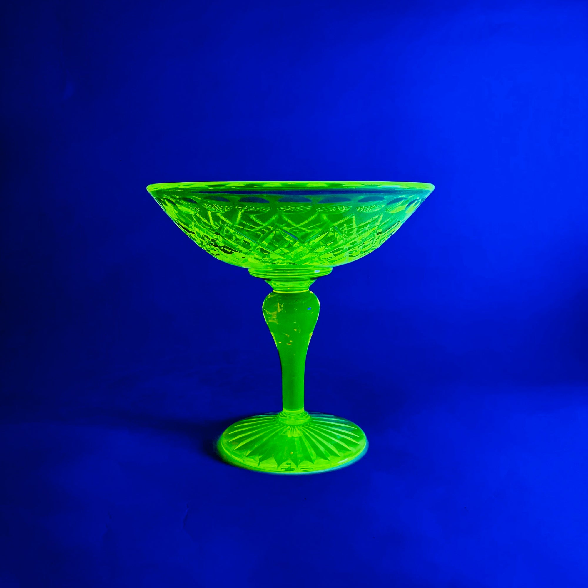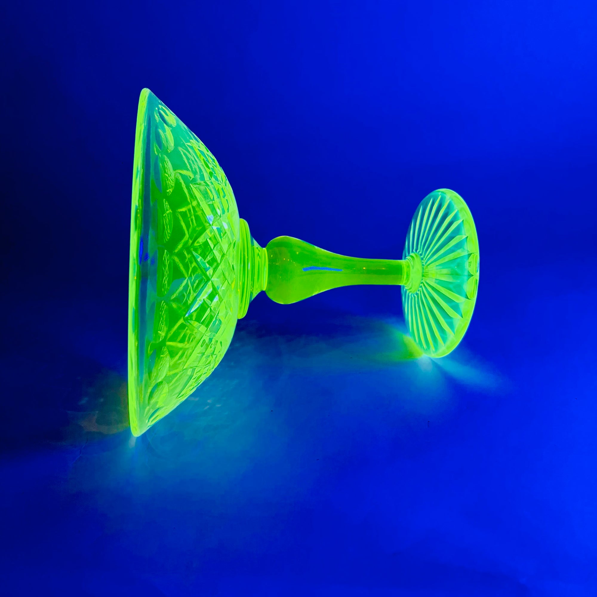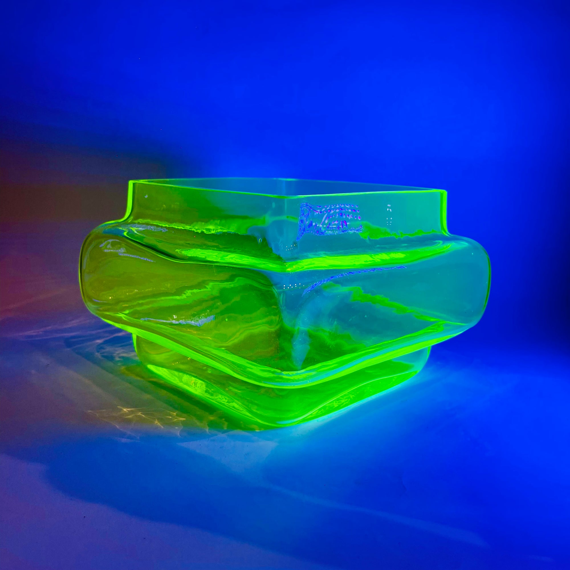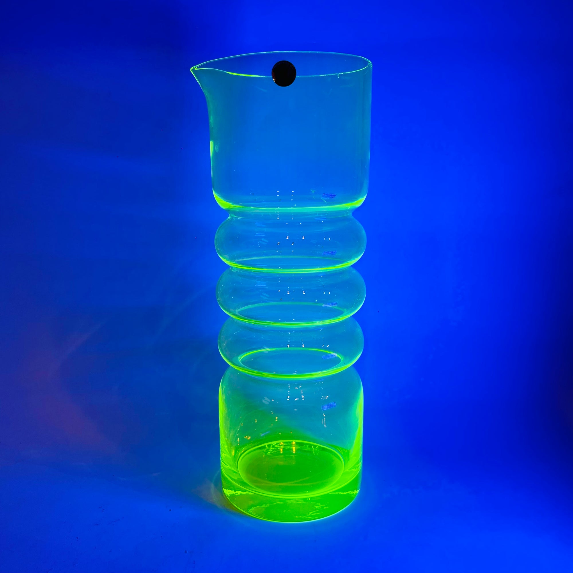We recommend that you view our display at night when all the uranium glass pieces are lit up to have the full experience. We are also posting daily on our Instagram and Facebook page editorial photos of each item where we discuss at length about how they were made and the history behind their maker.