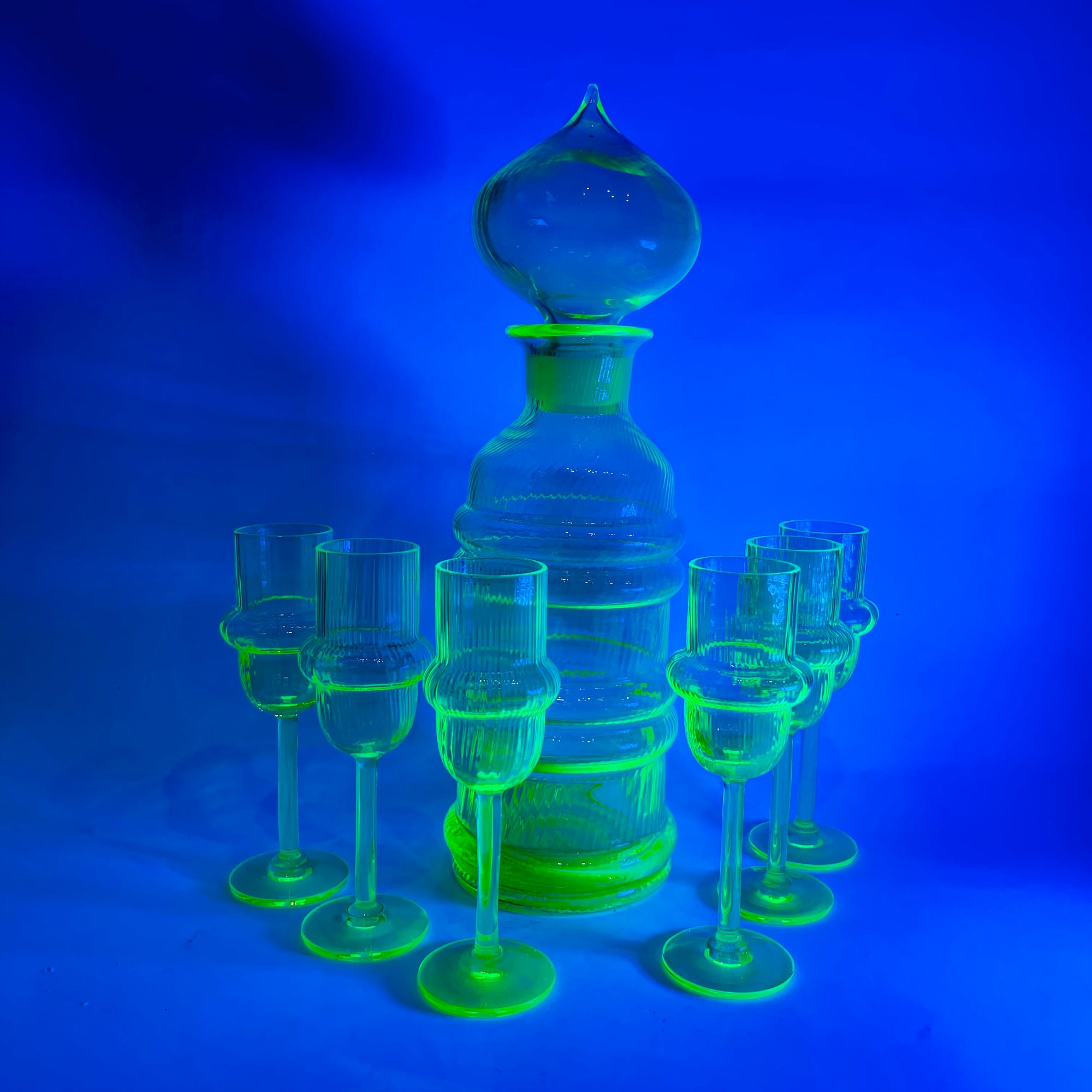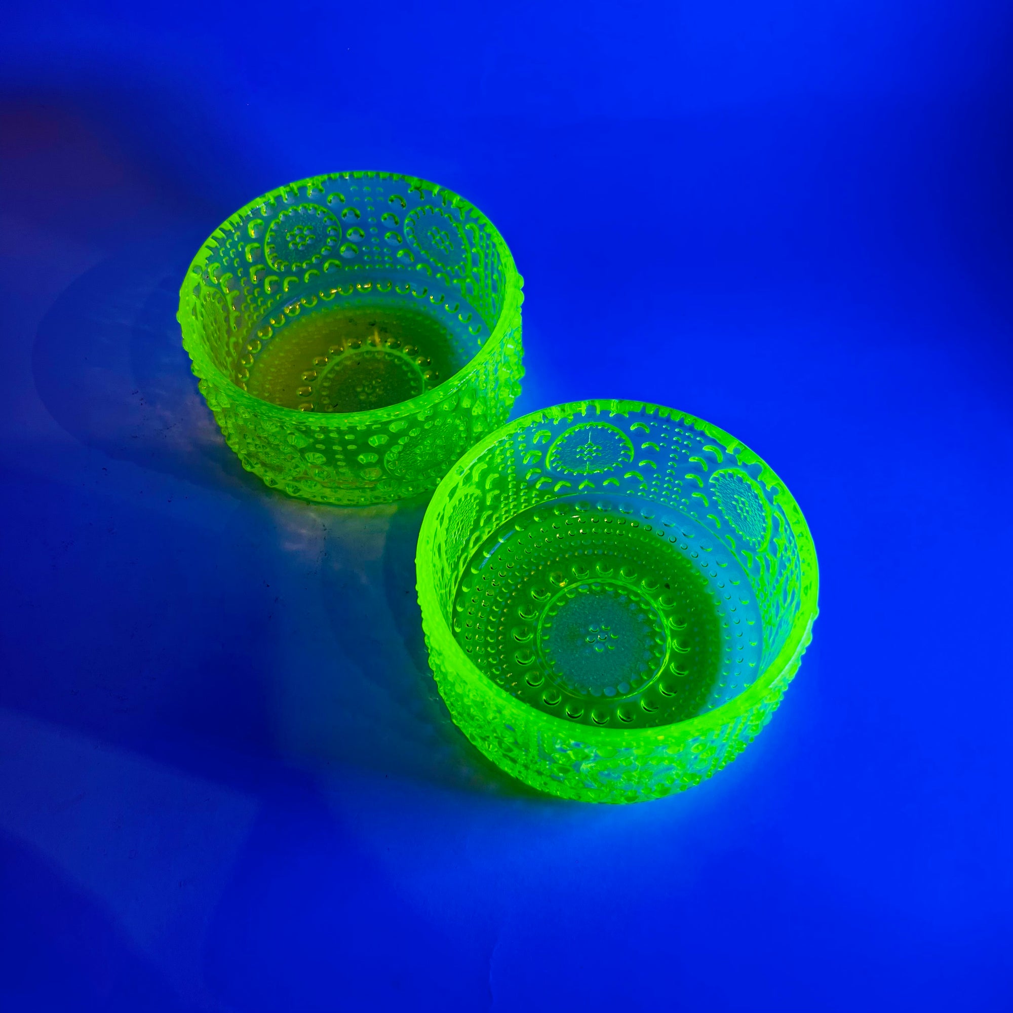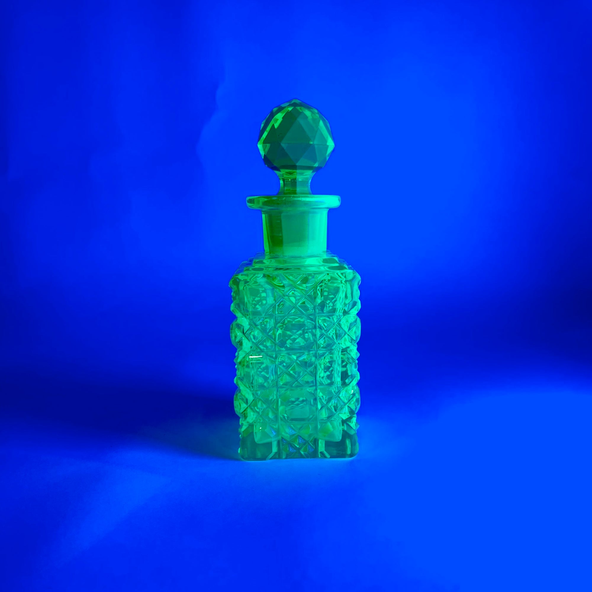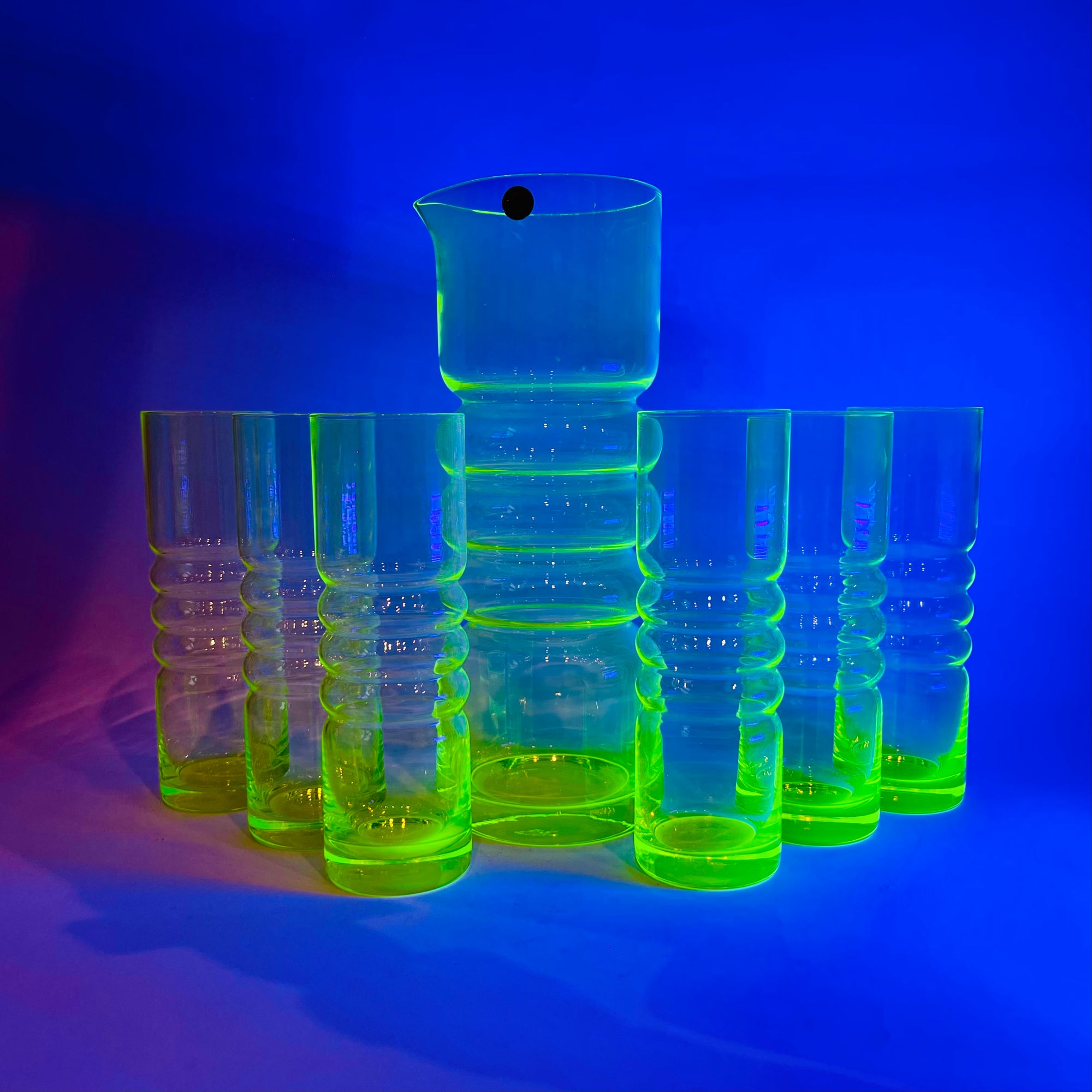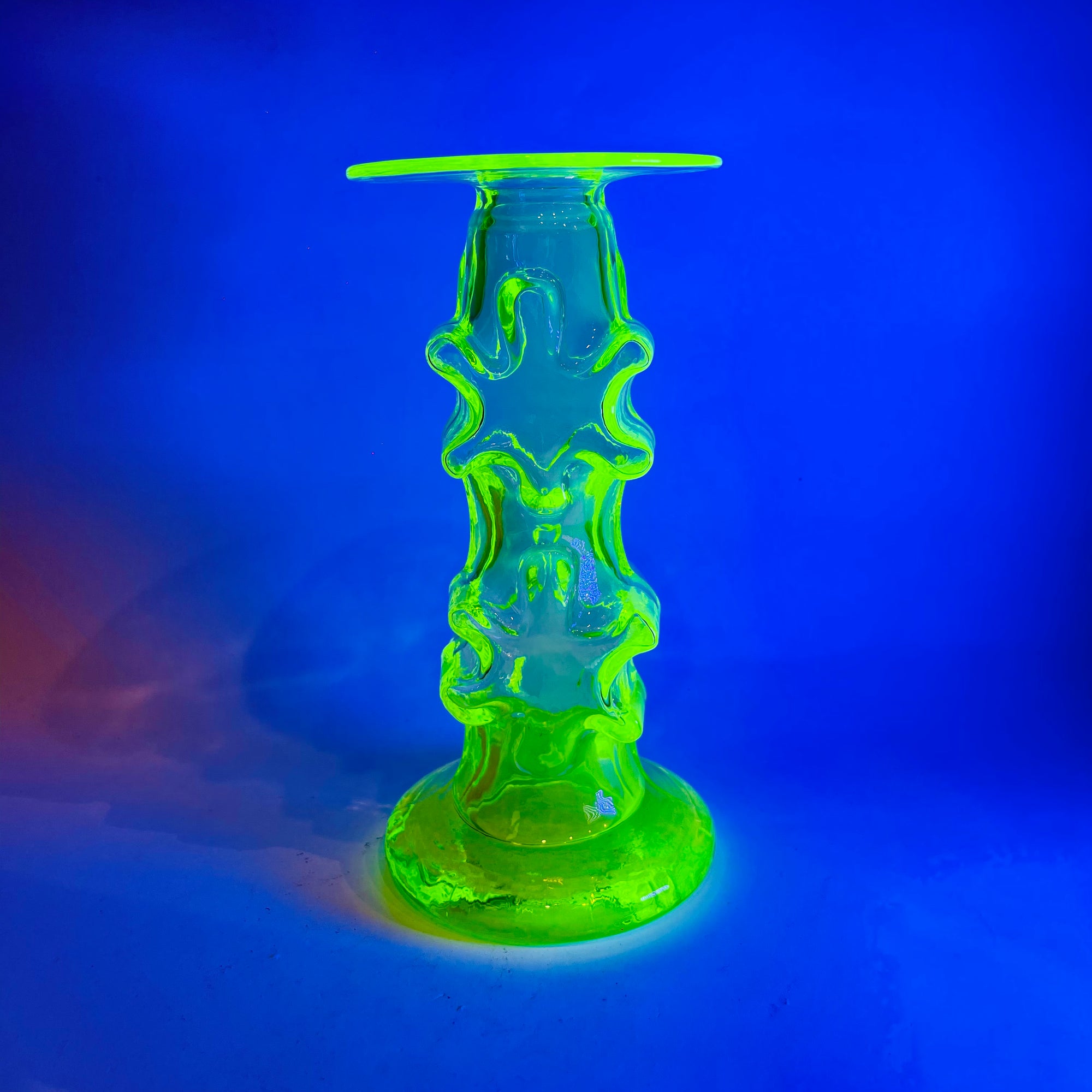 We recommend that you view our display at night when all the uranium glass pieces are lit up to have the full experience. We are also posting daily on our Instagram and Facebook page editorial photos of each item where we discuss at length about how they were made and the history behind their maker.