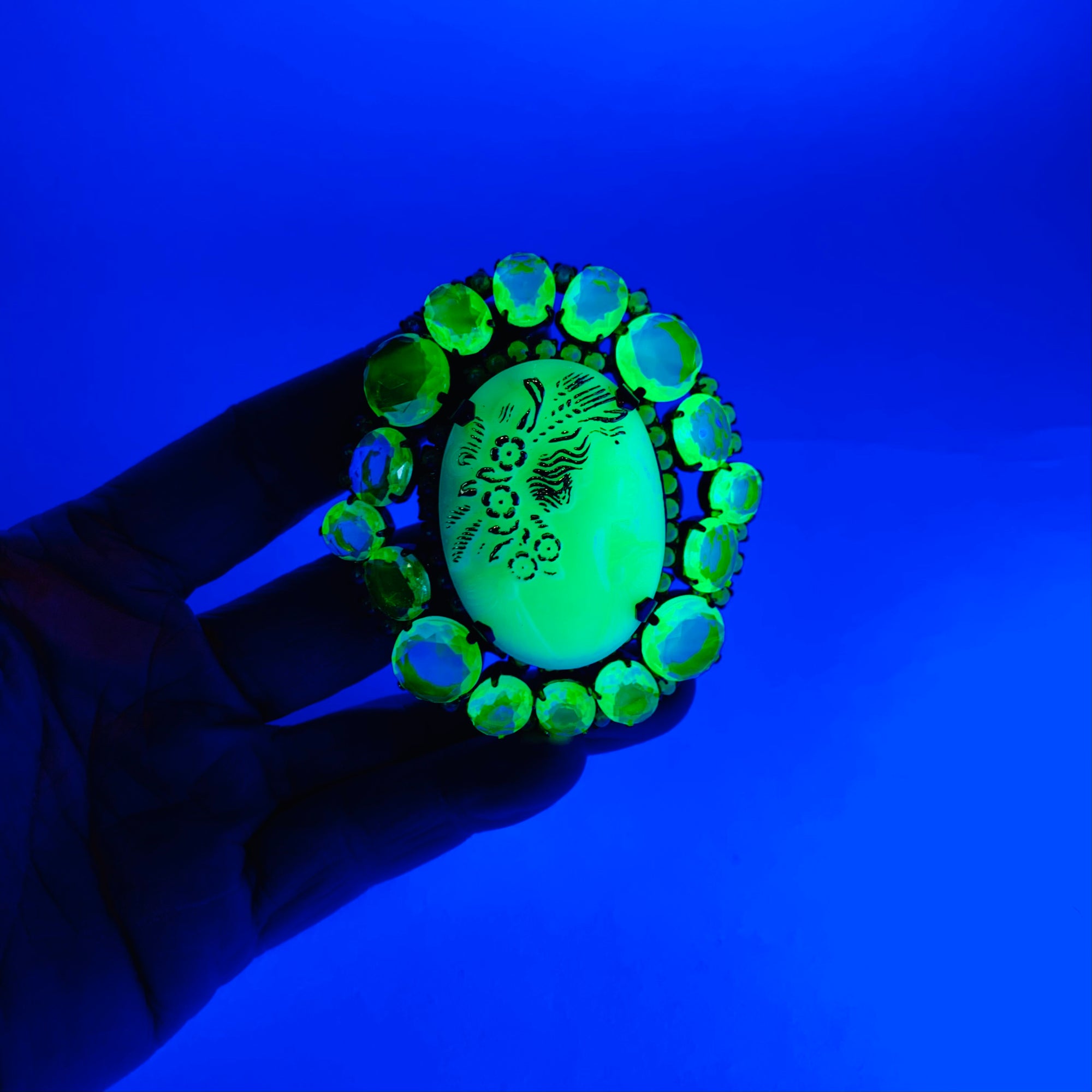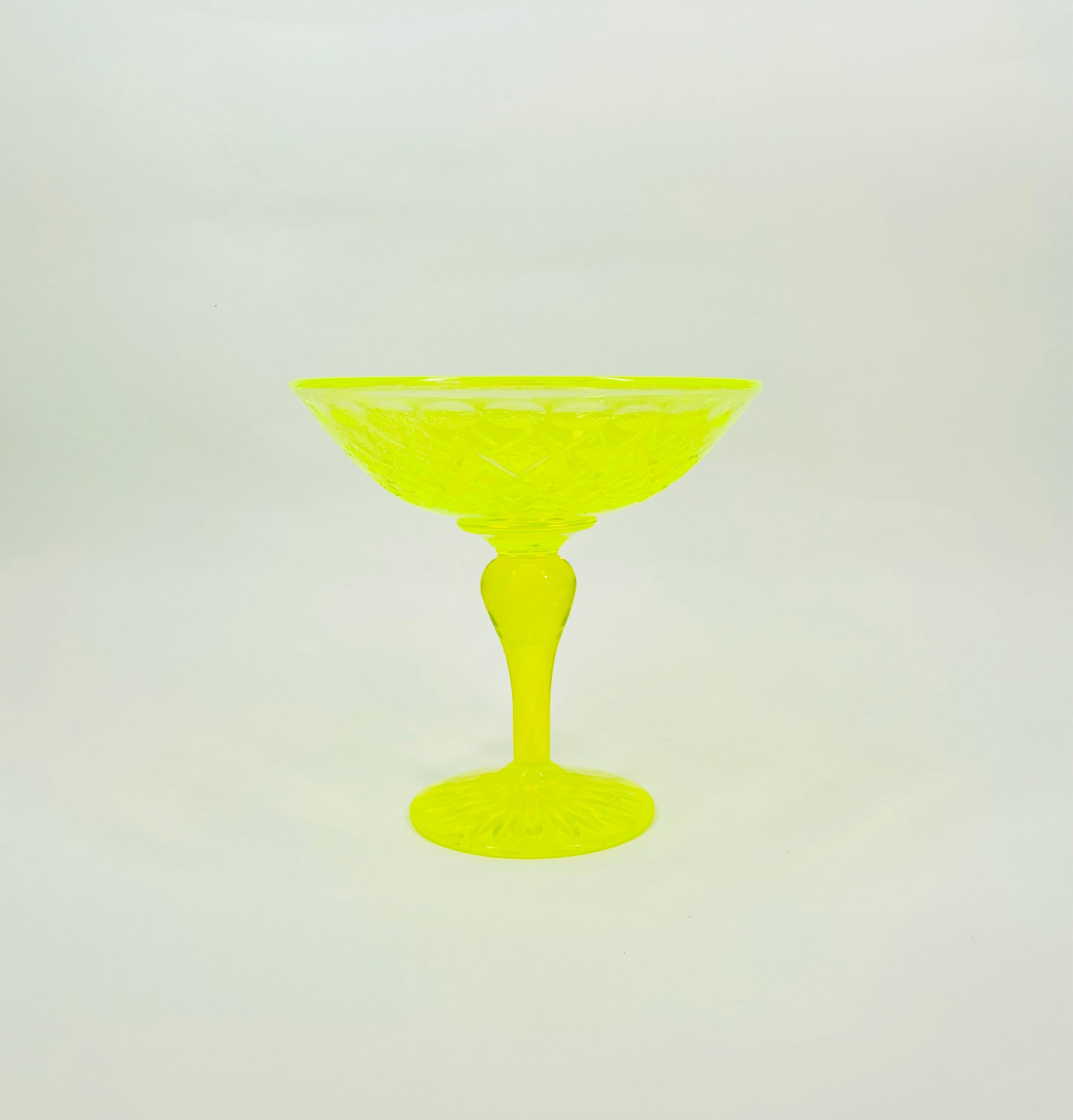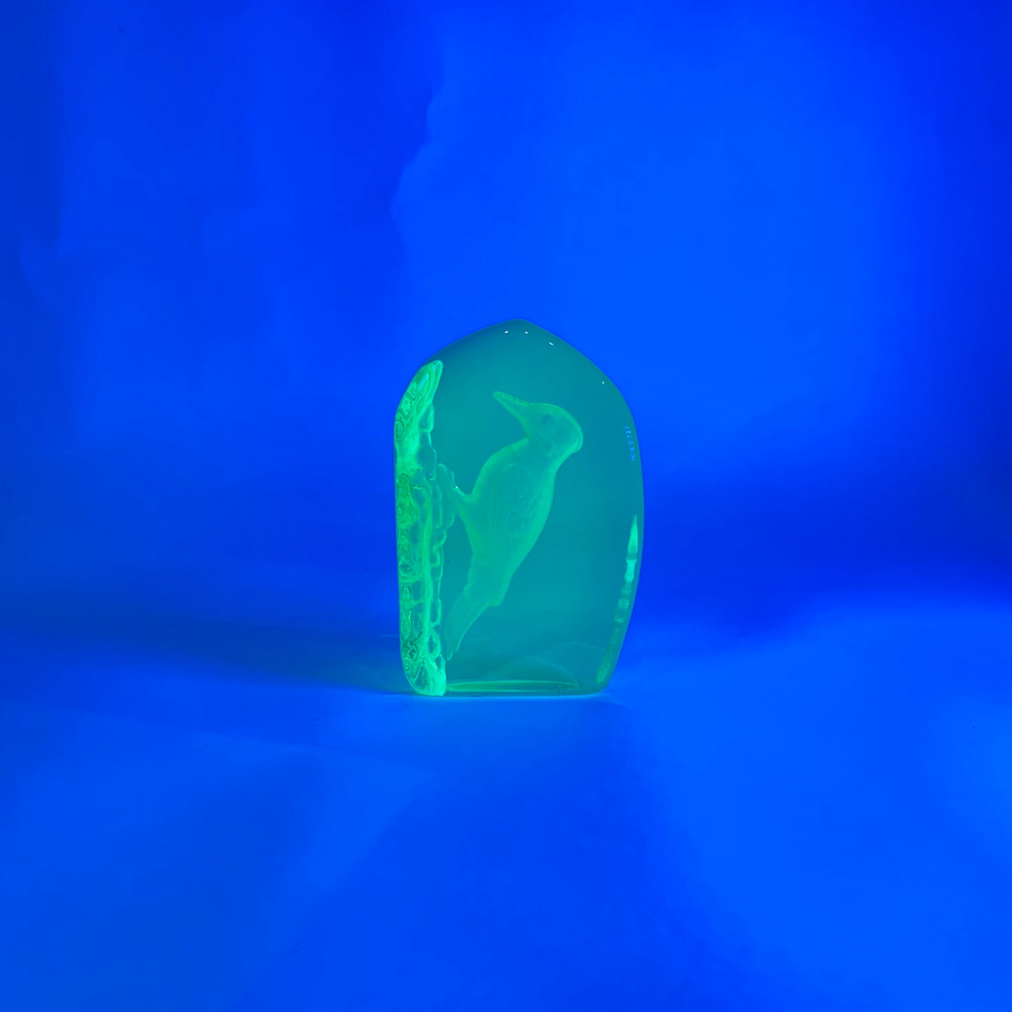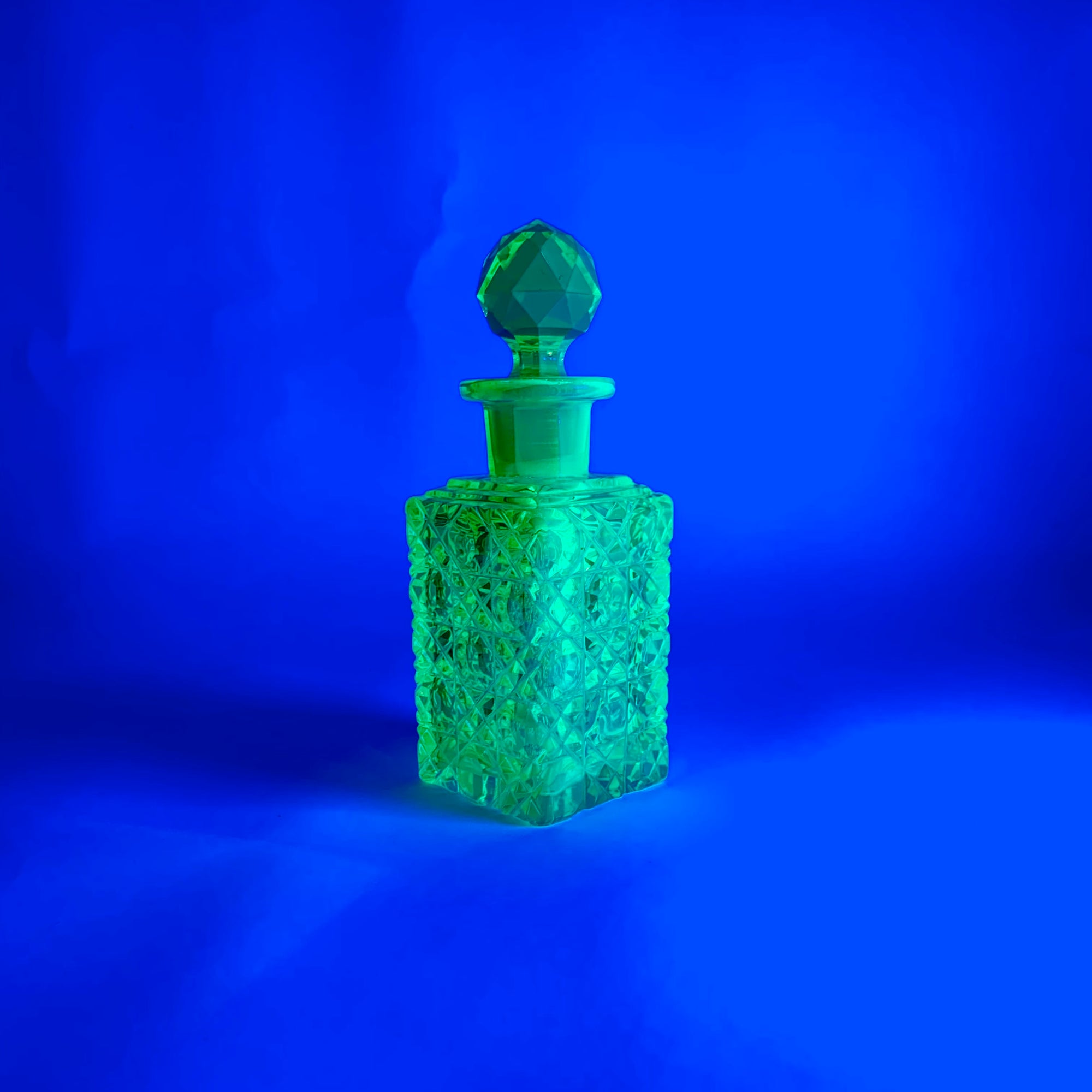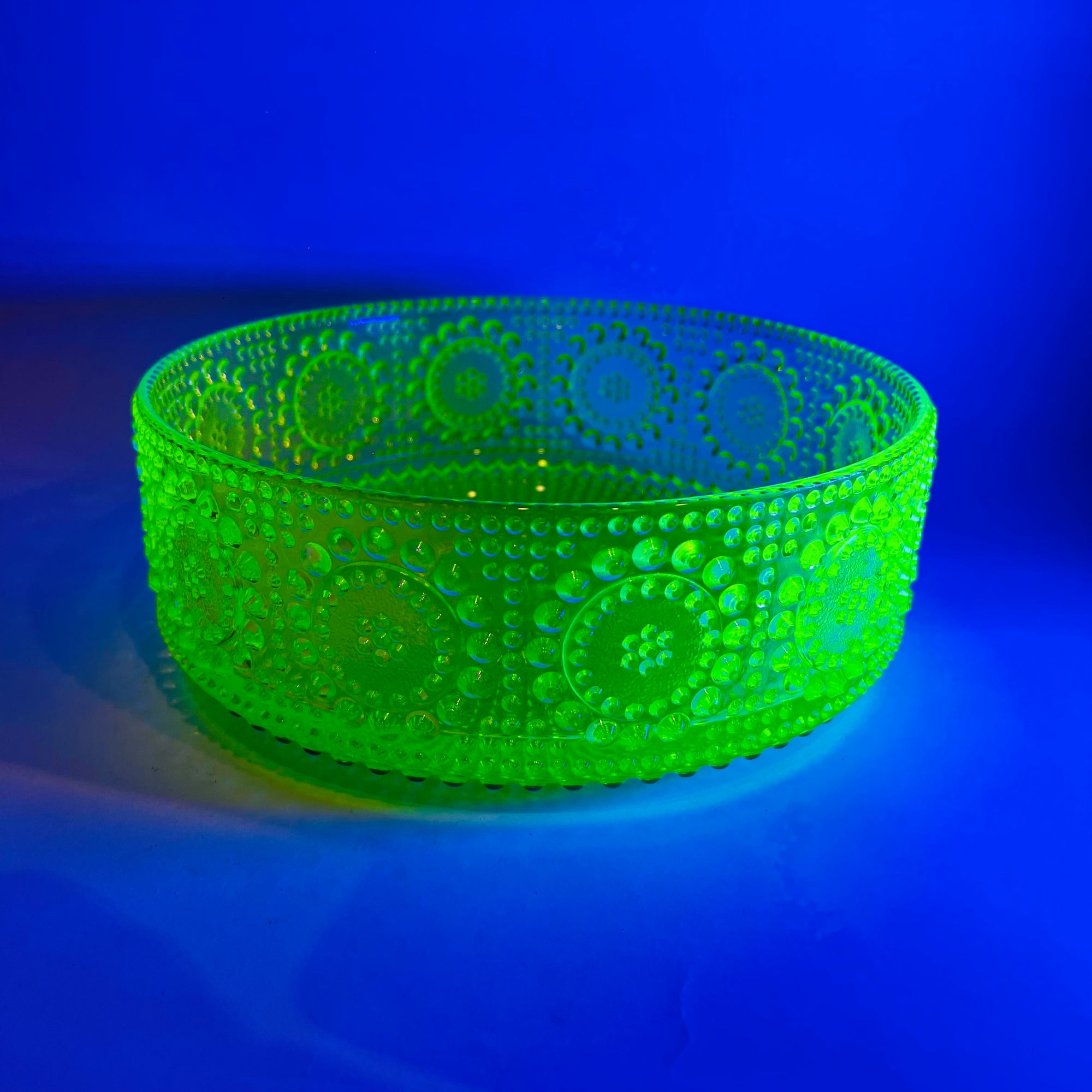 We recommend that you view our display at night when all the uranium glass pieces are lit up to have the full experience. We are also posting daily on our Instagram and Facebook page editorial photos of each item where we discuss at length about how they were made and the history behind their maker.