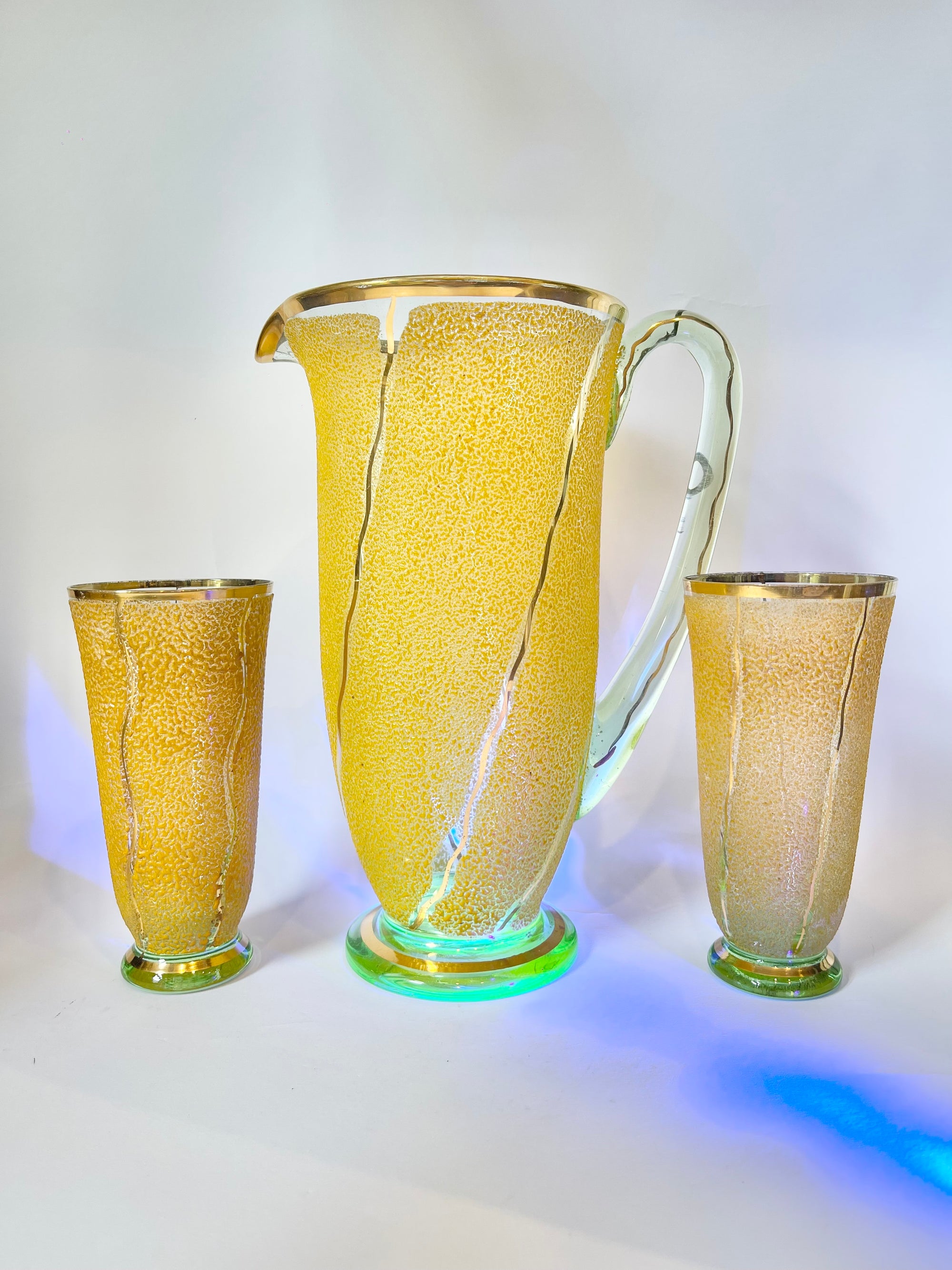 ANTIQUE ART DECO CRACKLED URANIUM GLASS JUG SET