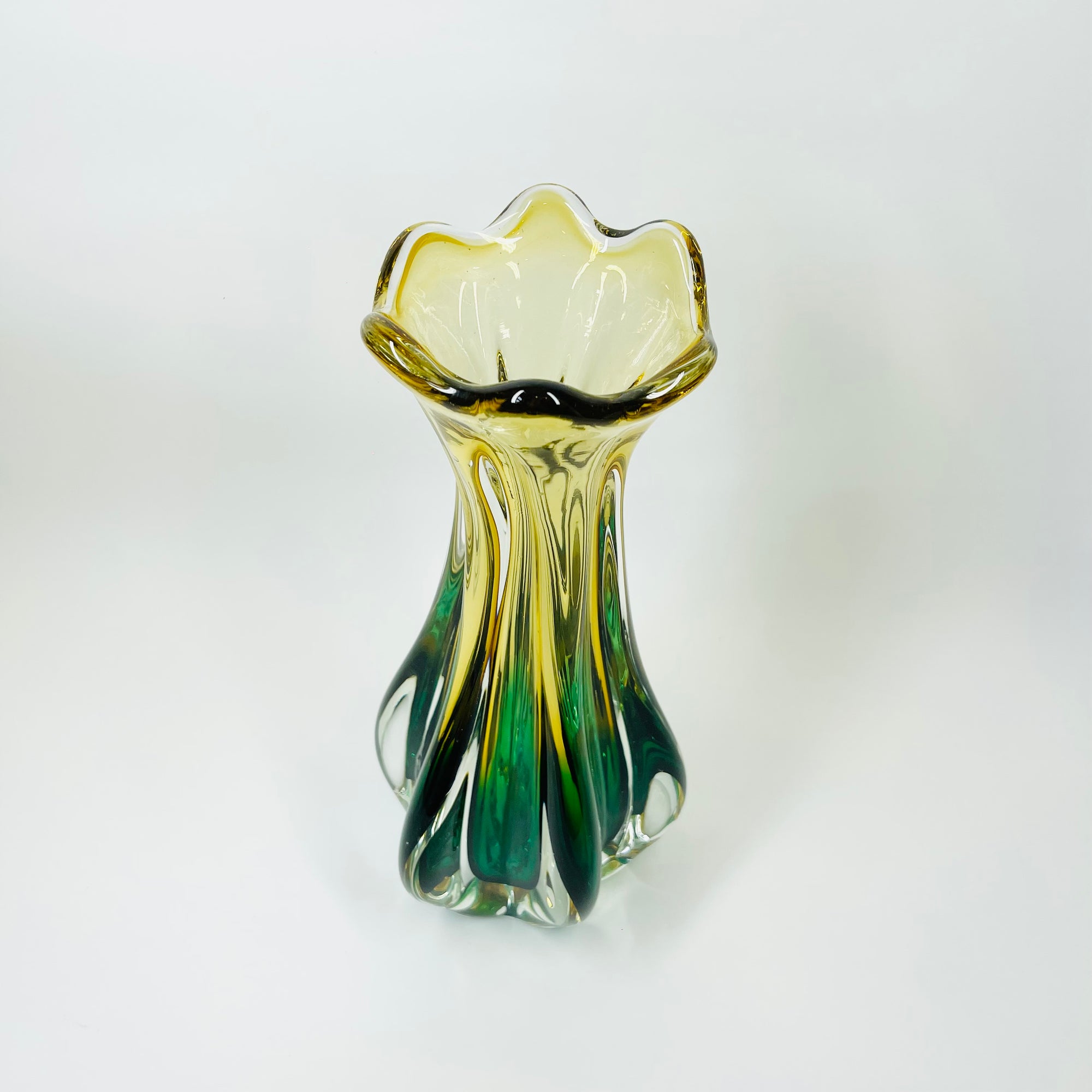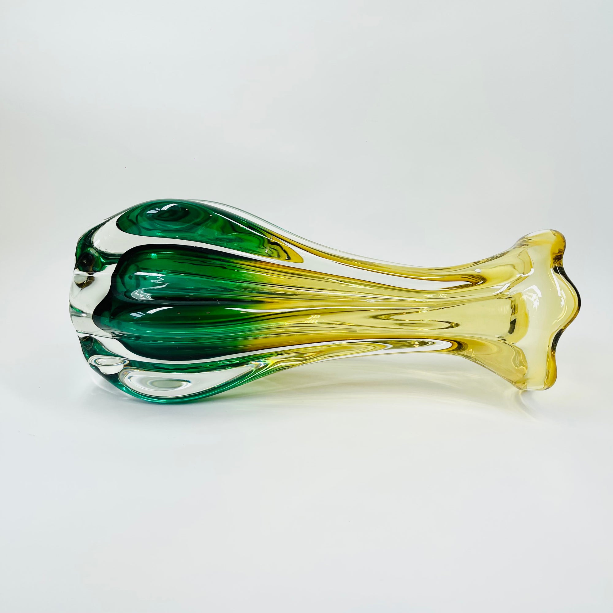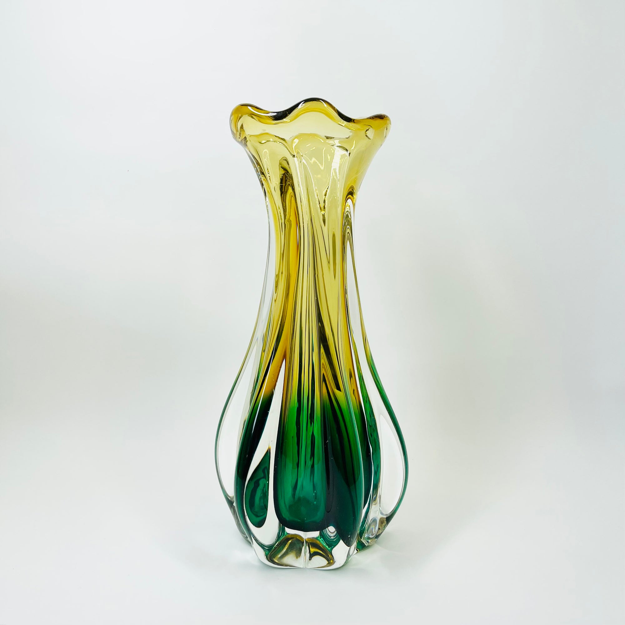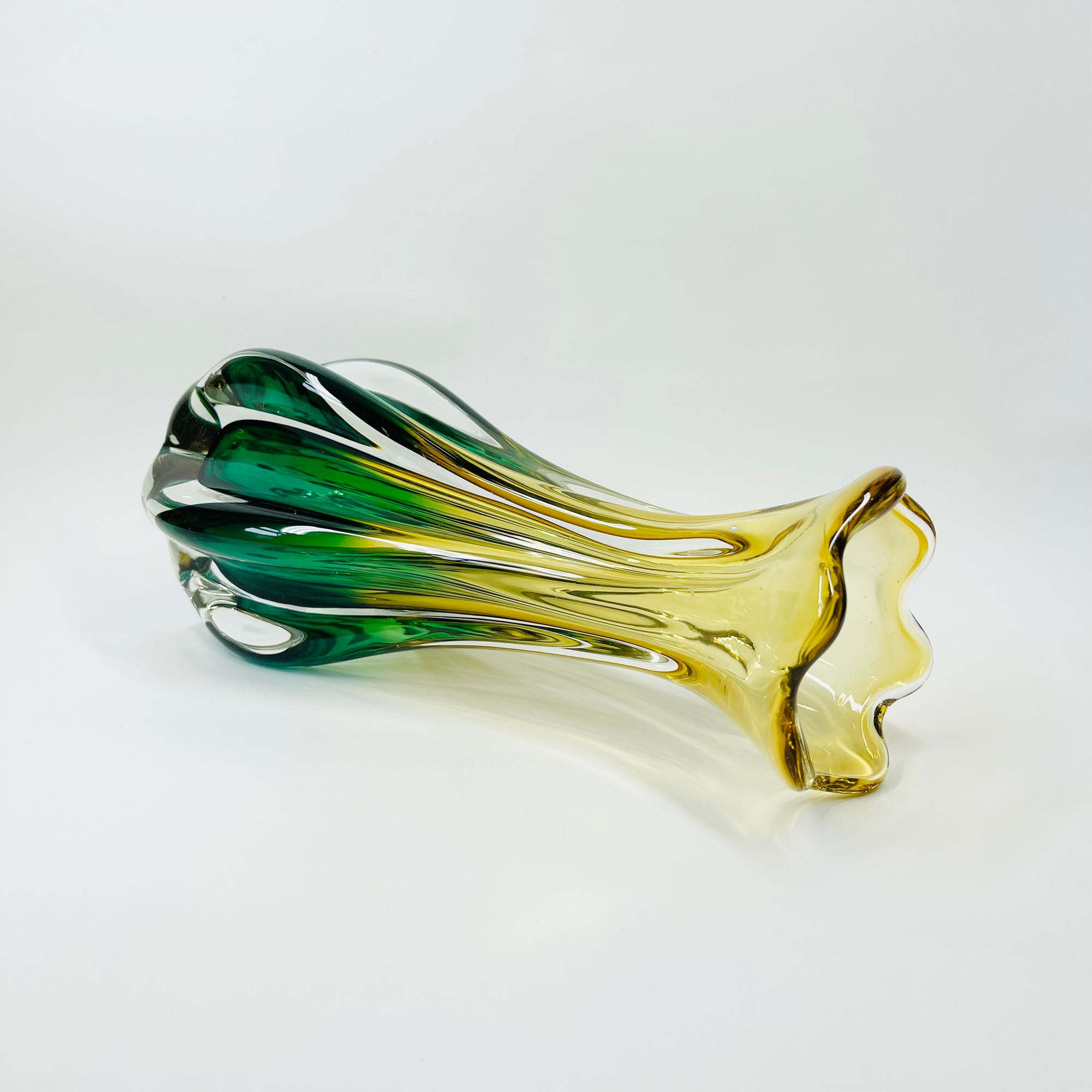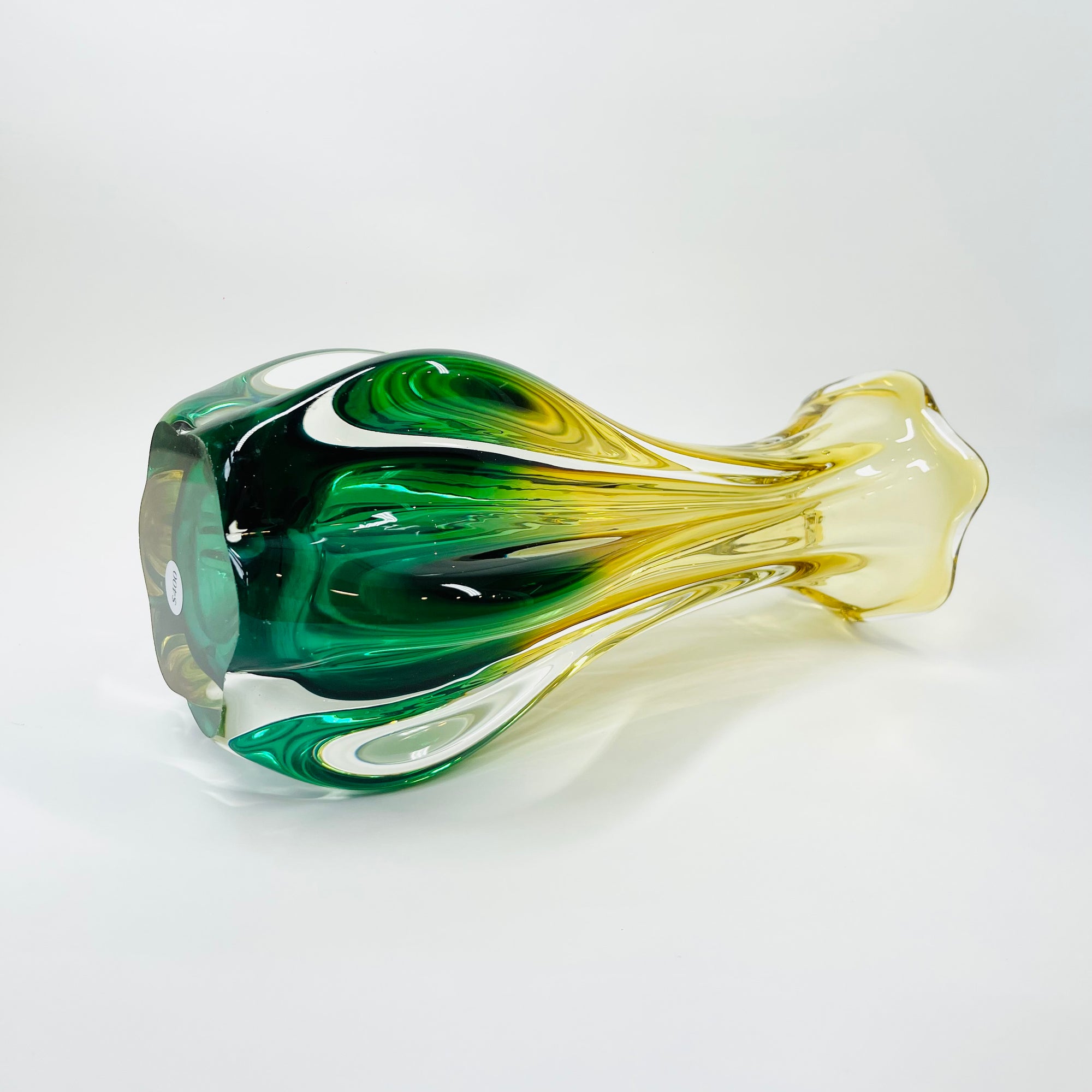 1970s JAPANESE HINERI GREEN AMBER SOMMERSO GLASS TWIST VASE
