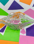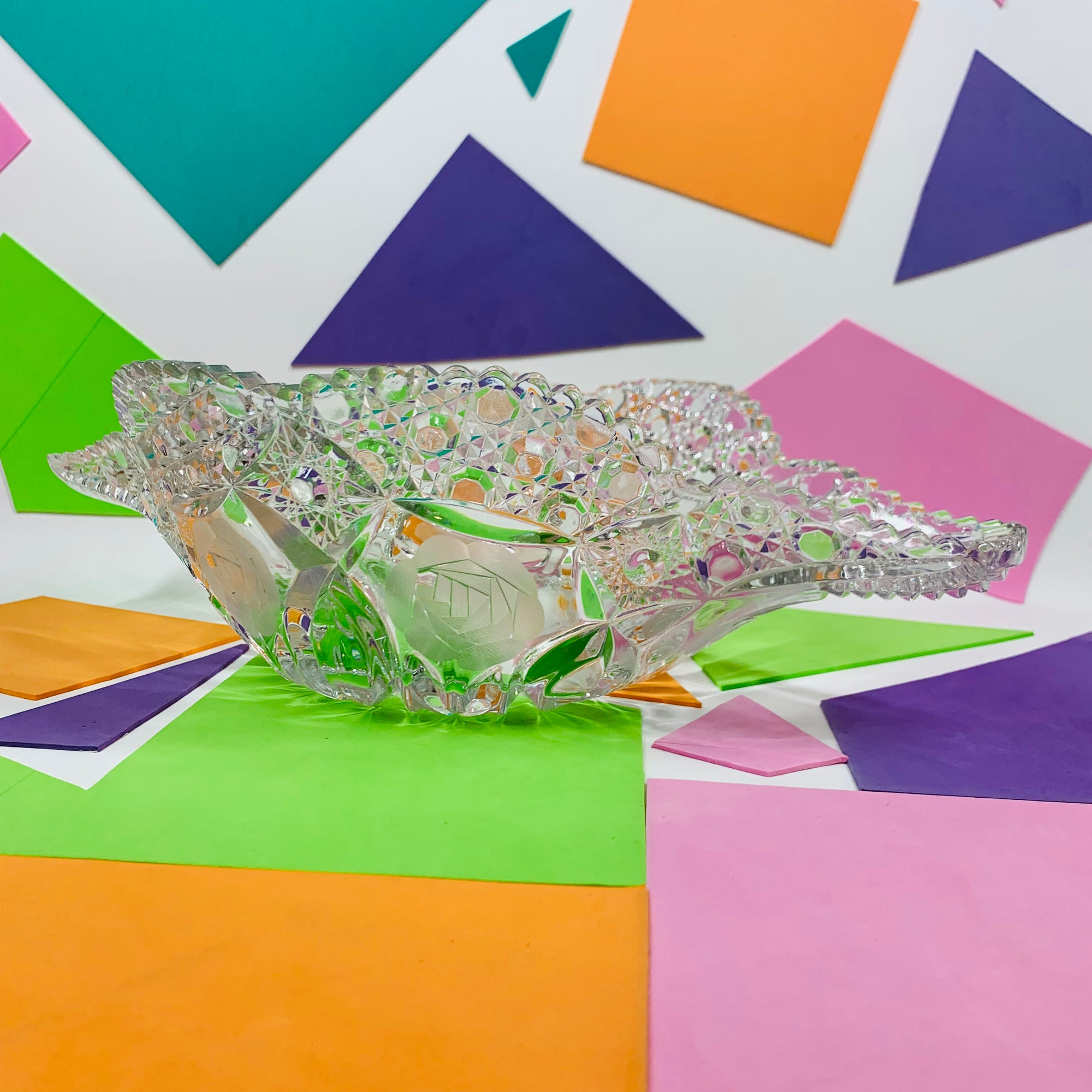 30cm x 16cmx 10cm, in good condition. Thick, heavy pressed crystal.