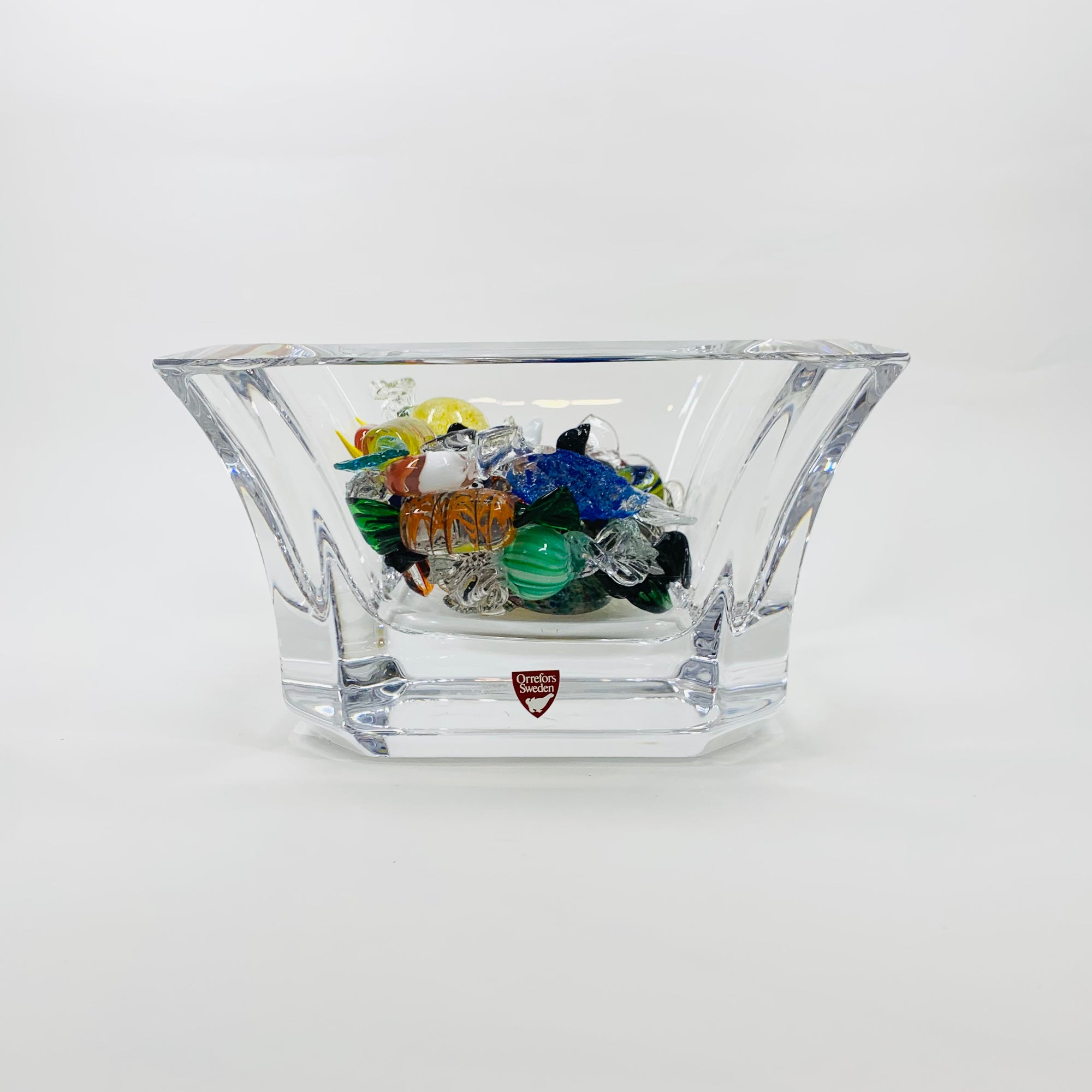 16cm x 12cm, in good vintage condition. Original Orrefors stamp intact. Stunning, heavy 2kg of thick glass. Sold without glass lollies.