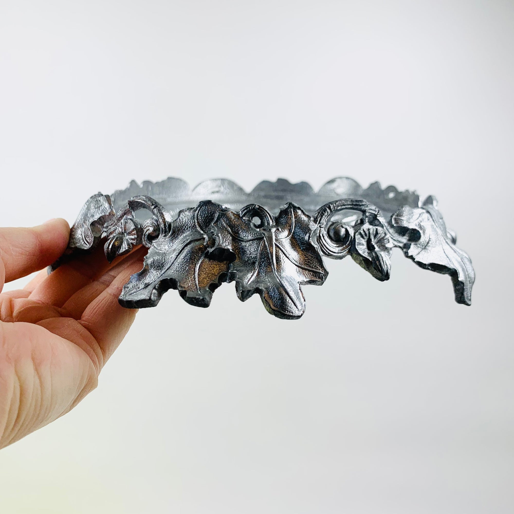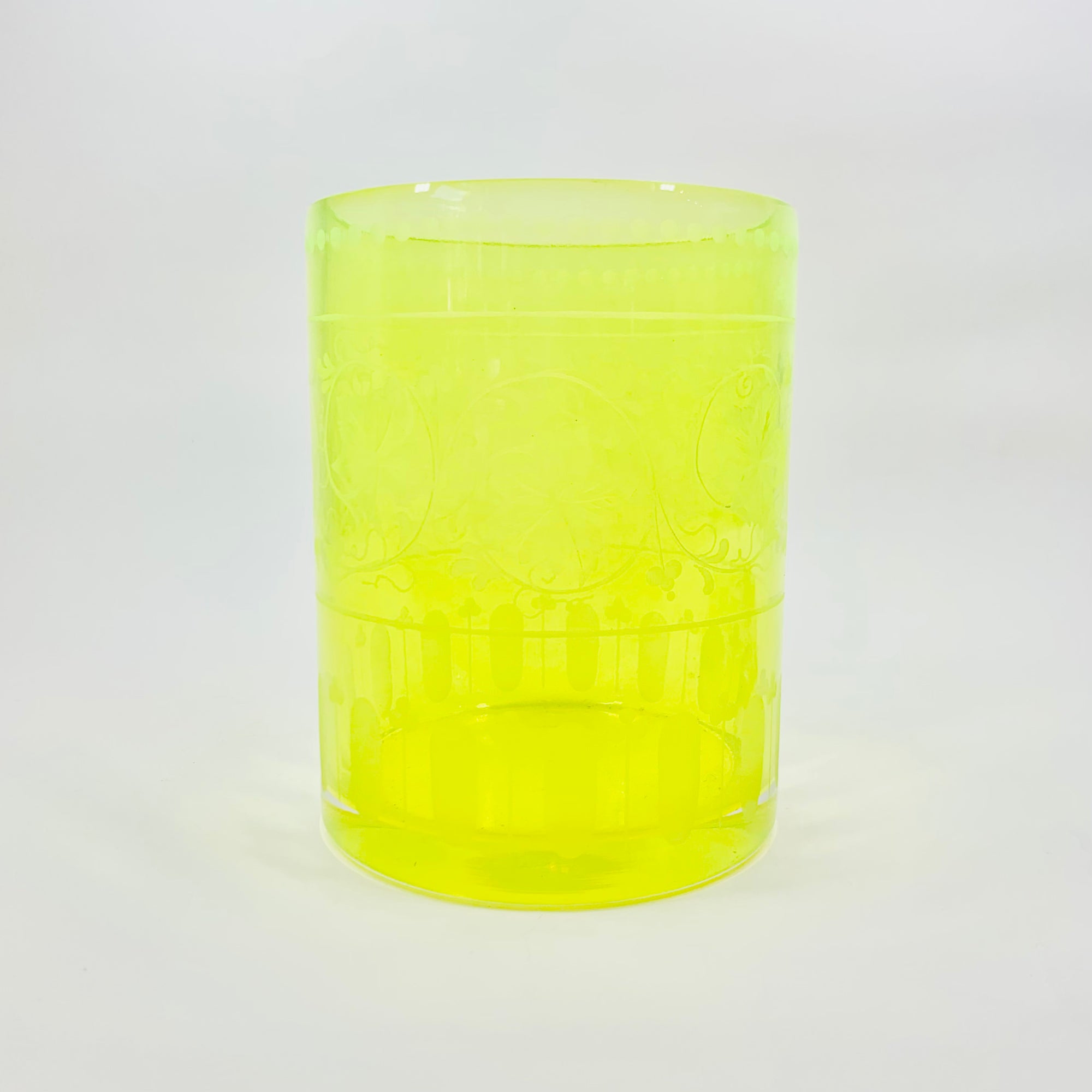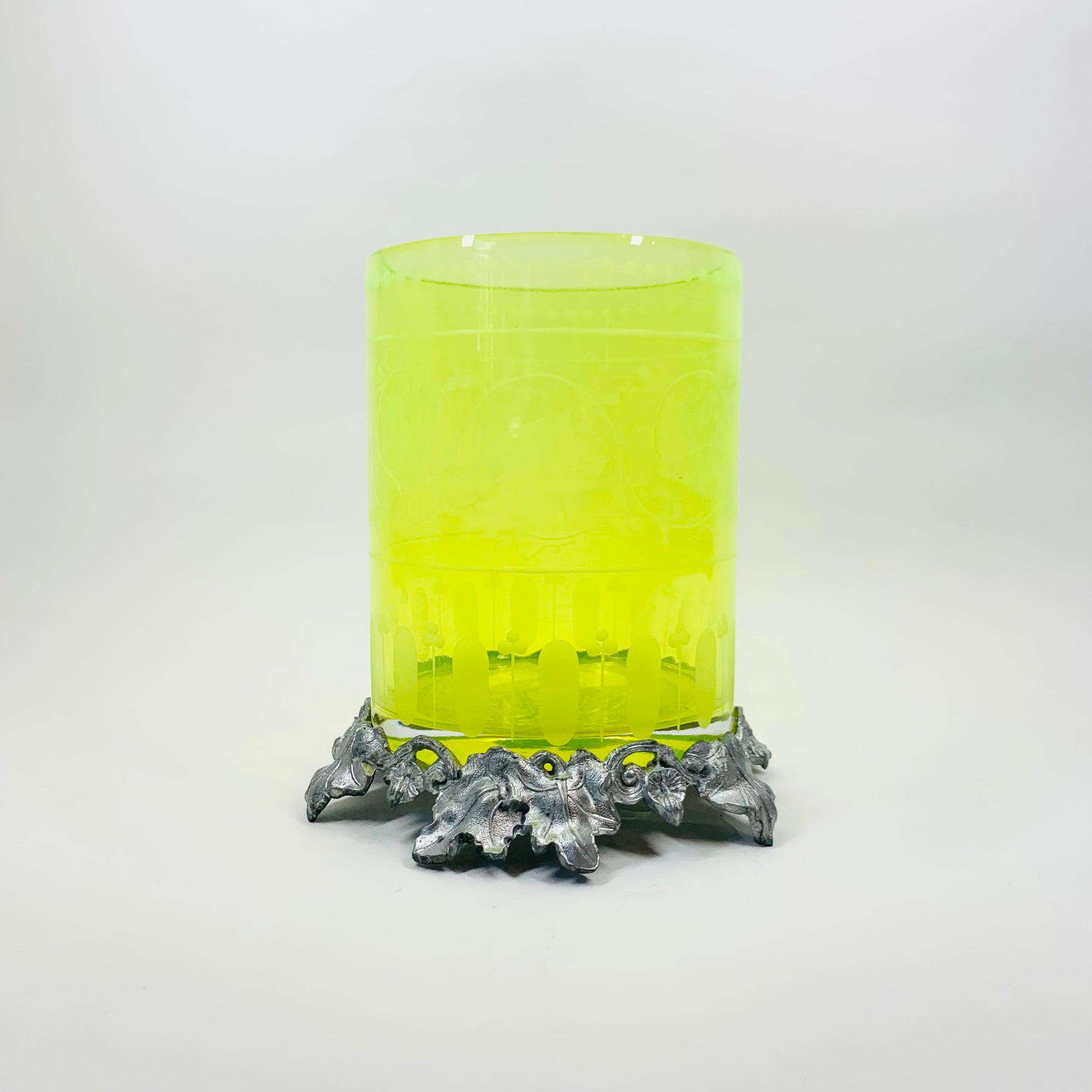 •extremely rare late Victorian uranium glass vase with pewter base. Etched with lace and floral pattern, a real stunner for any collector.